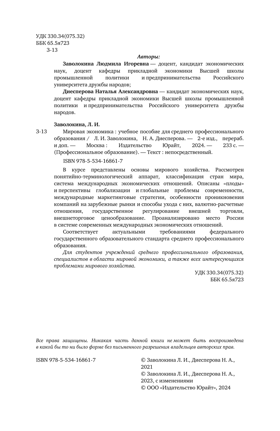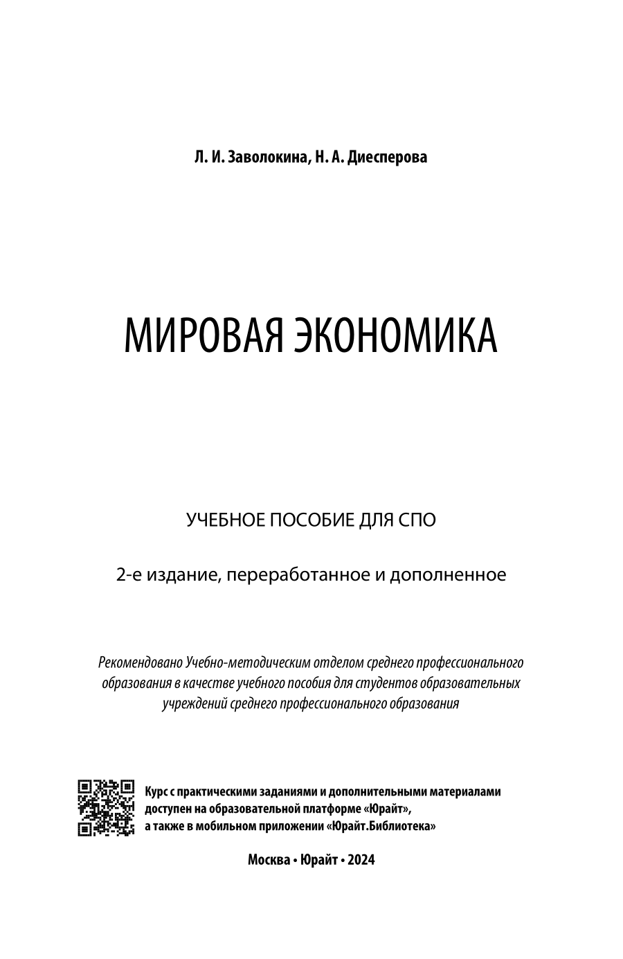 Мировая экономика 2-е изд. пер. и доп. Учебное пособие для СПО (Людмила Игоревна Заволокина); ЮРАЙТ, 2023