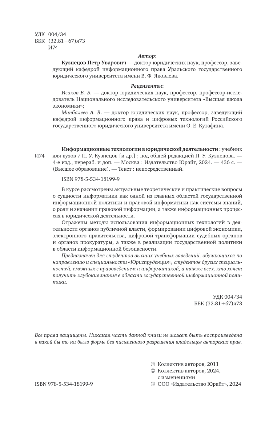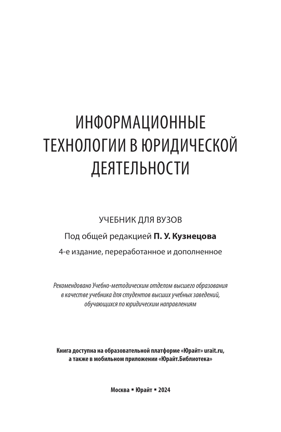 Информационные технологии в юридической деятельности 4-е изд. пер. и доп. Учебник для вузов (Анатолий Александрович Стрельцов); ЮРАЙТ, 2024