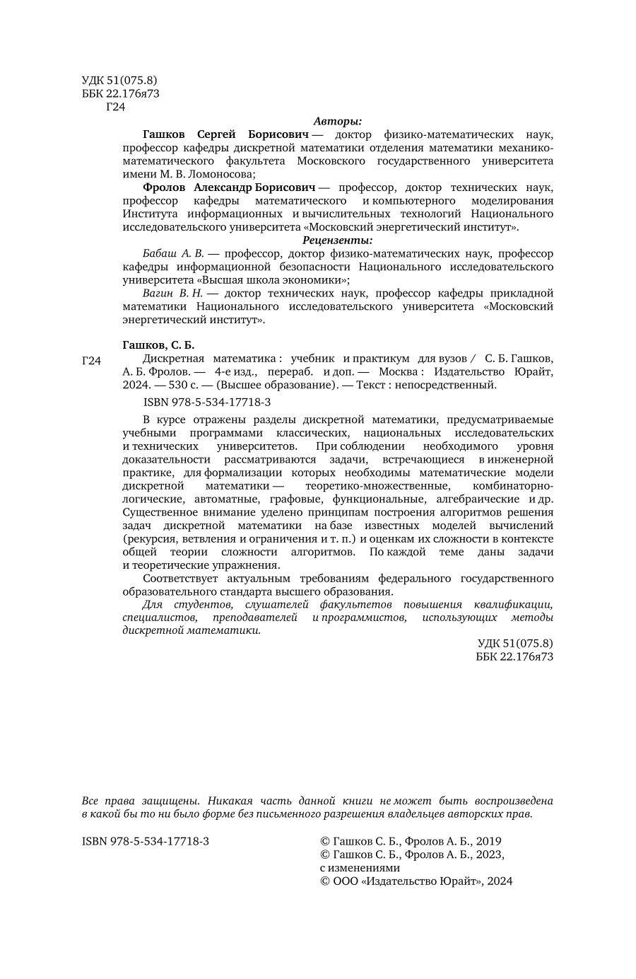 Дискретная математика 4-е изд. пер. и доп. Учебник и практикум для вузов (С. Б. Гашков); ЮРАЙТ, 2023