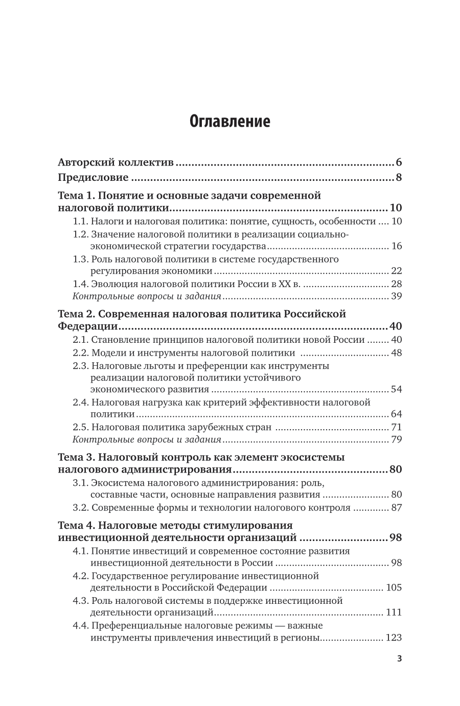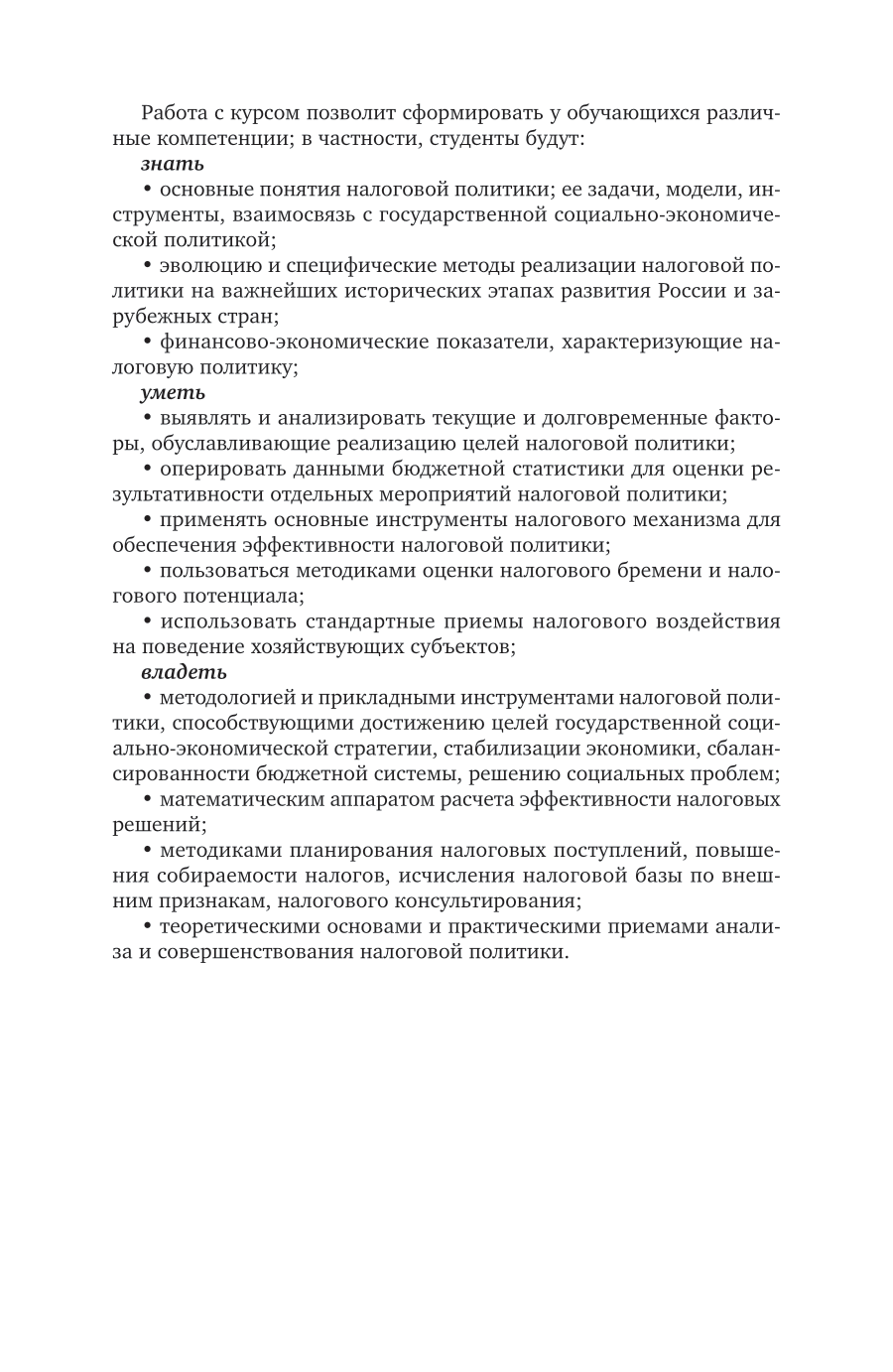 В курсе рассматриваются основы современной государственной налоговой политики: понятие, задачи, историческая эволюция, современные формы реализации. Дается характеристика проблем и направлений налогового регулирования экономики, излагаются дискуссионные вопросы налоговой политики Российской Федерации, представлены схемы, статистический материал и примеры реализации направлений налоговой политики на современном этапе экономического развития. Курс подготовлен в соответствии с актуальными требованиями федерального государственного стандарта высшего образования. Для студентов высших учебных заведений, обучающихся по экономическим направлениям.