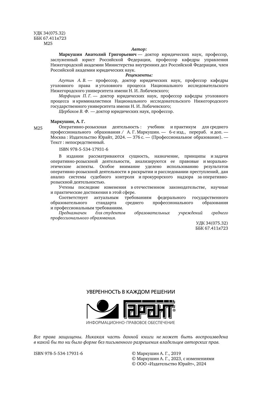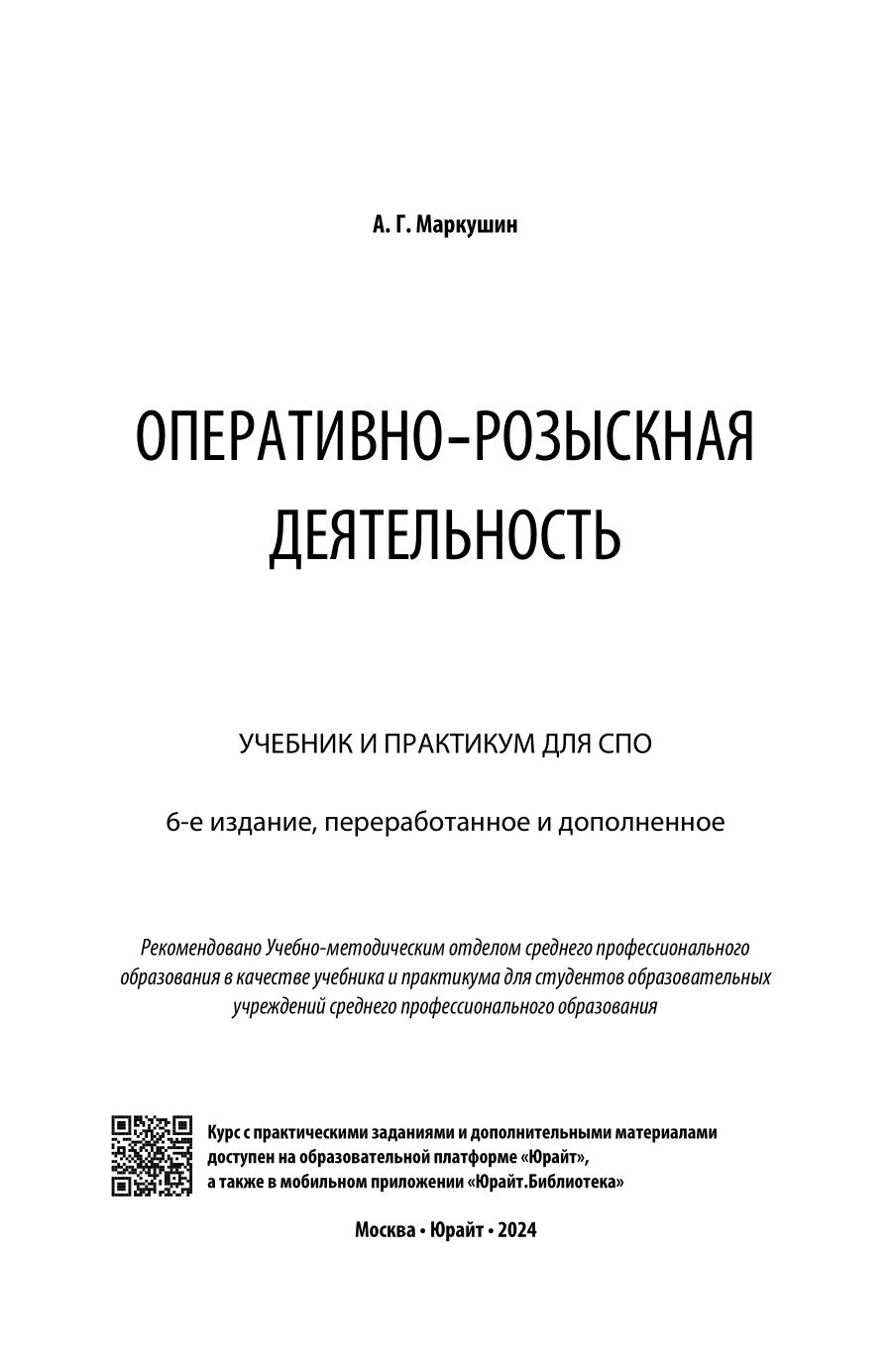 Оперативно-розыскная деятельность 6-е изд. пер. и доп. Учебник и практикум для СПО (Анатолий Григорьевич Маркушин); ЮРАЙТ, 2023