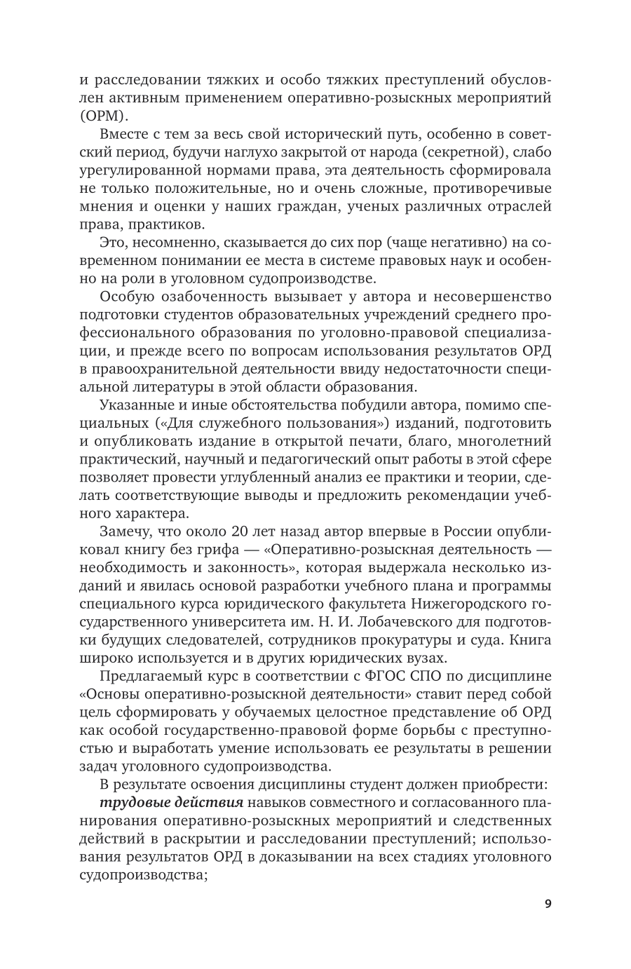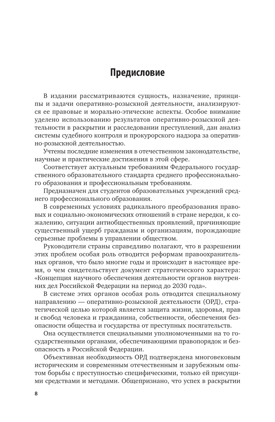 В издании рассматриваются сущность, назначение, принципы и задачи оперативно-розыскной деятельности, анализируются ее правовые и морально-этические аспекты. Особое внимание уделено использованию результатов оперативно-розыскной деятельности в раскрытии и расследовании преступлений, дан анализ системы судебного контроля и прокурорского надзора за оперативно-розыскной деятельностью. Учтены последние изменения в отечественном законодательстве, научные и практические достижения в этой сфере. Соответствует актуальным требованиям Федерального государственного образовательного стандарта среднего профессионального образования и профессиональным требованиям. Предназначен для студентов образовательных учреждений среднего профессионального образования.