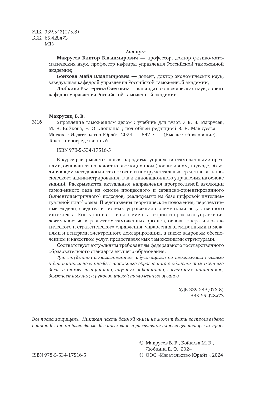 Управление таможенным делом. Учебник для вузов (Макрусев Виктор Владимирович; Бойкова Майя Владимировна; Любкина Екатерина Олеговна), 2024