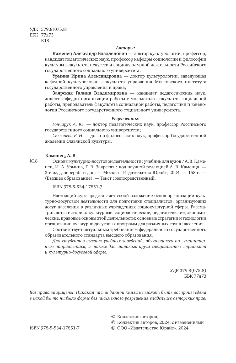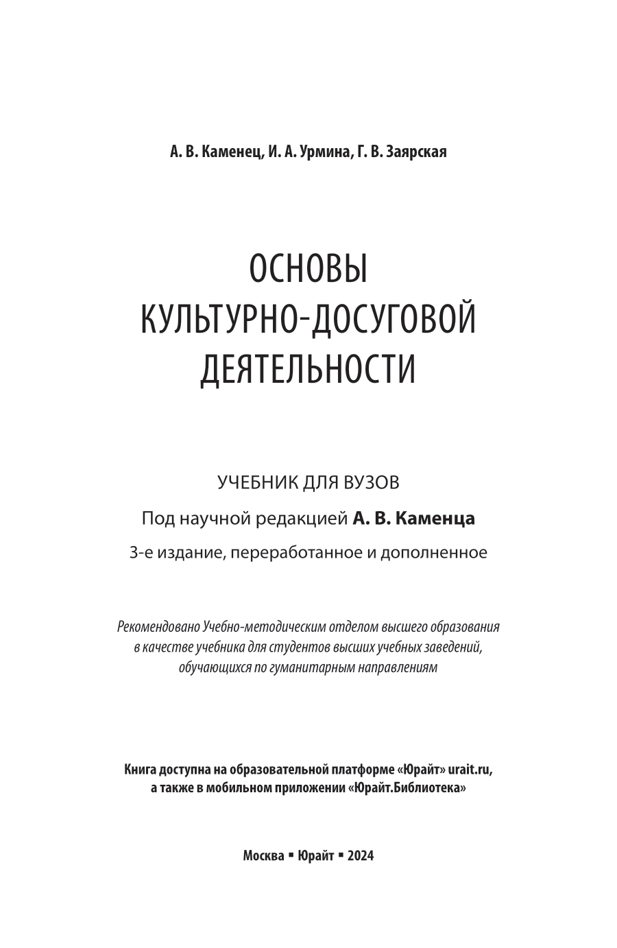 Основы культурно-досуговой деятельности 3-е изд. пер. и доп. Учебник для вузов (Каменец Александр Владленович; Урмина Ирина Александровна; Заярская Галина Владимировна), 2024