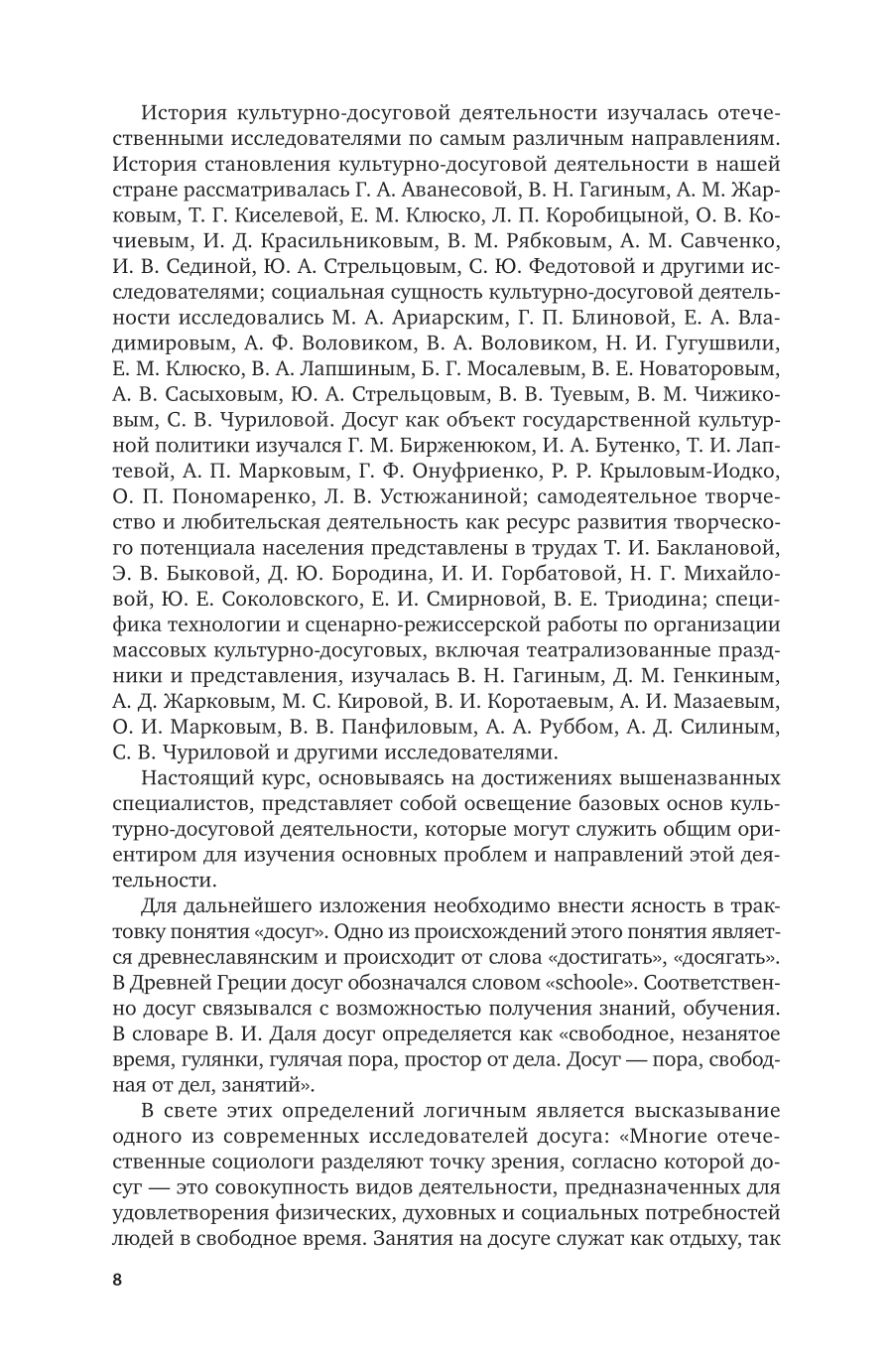 Настоящий курс представляет собой изложение основ организации культурно-досуговой деятельности для подготовки специалистов, организующих досуг населения в различных учреждениях социокультурной сферы. Рассматриваются историко-культурные, социологические, педагогические, экономические, правовые основы этой деятельности; основные стратегии и технологии организации культурно-досуговых программ для различных групп населения. Cоответствует актуальным требованиям федерального государственного образовательного стандарта высшего образования. Для студентов высших учебных заведений, обучающихся по гуманитарным направлениям, а также для широкого круга специалистов социальной и культурно-досуговой сферы.