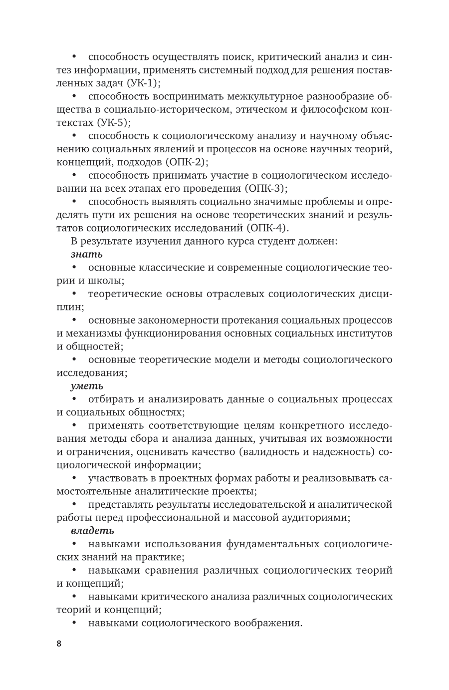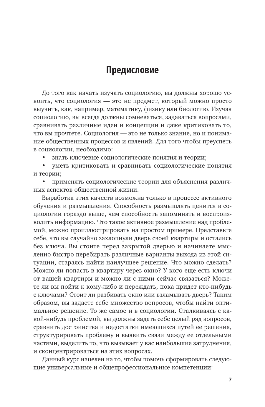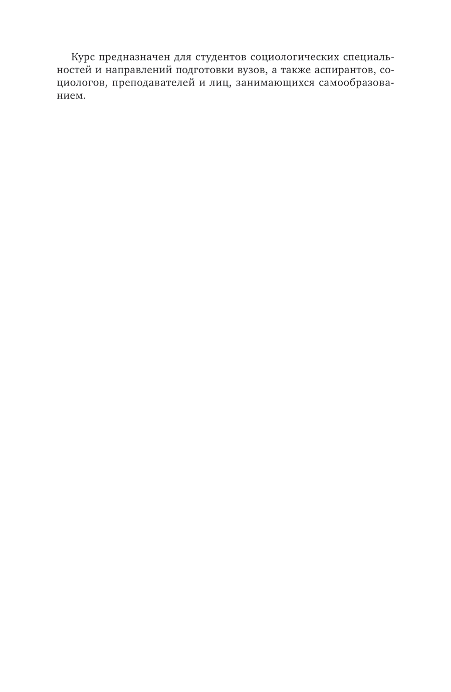 Представленный вашему вниманию курс охватывает основные темы современной социологии. Его новаторство состоит в том, что он нацелен не только на трансляцию накопленных социологией знаний и представлений об обществе, но и на формирование у учащихся социологического мышления и воображения. Несомненным достоинством курса является то, что теоретические аспекты той или иной темы раскрываются через живые примеры из реального функционирования общества. Изложение учебного материала носит проблемный характер, дается несколько точек зрения по рассматриваемому предмету, показываются их плюсы и минусы. Соответствует актуальным требованиям федерального государственного образовательного стандарта высшего образования. Для студентов высших учебных заведений, обучающихся по гуманитарным направлениям, преподавателей и всех интересующихся вопросами современной социологии.