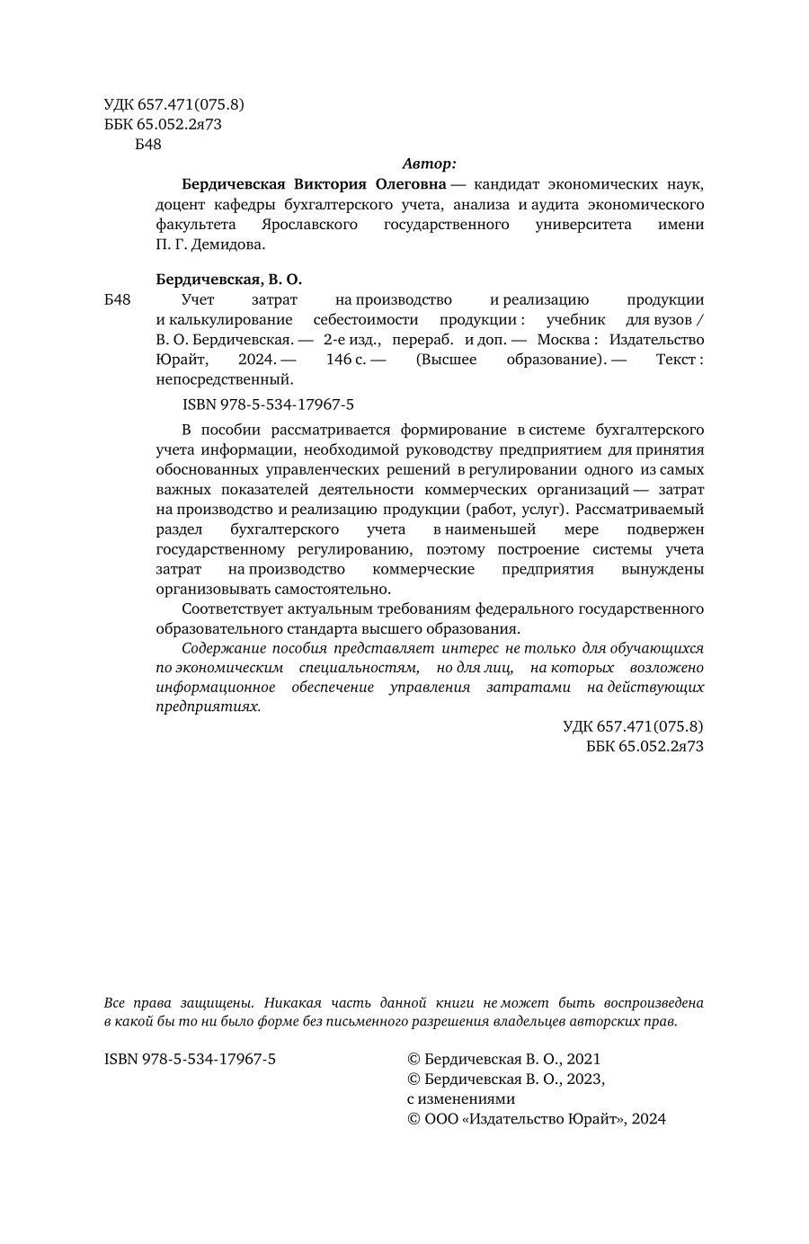 Учет затрат на производство и реализацию продукции и калькулирование себестоимости продукции 2-е изд. пер. и доп. Учебник для вузов (Виктория Олеговна Бердичевская); ЮРАЙТ, 2023