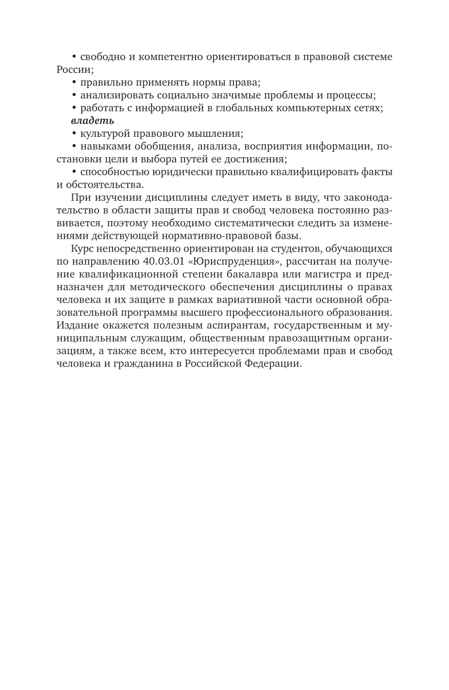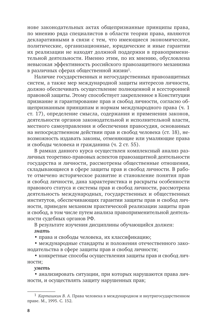 Курс раскрывает деятельность органов государственной власти и институтов гражданского общества в сфере защиты прав личности, дает возможность получить представление о правах личности, системе правовой гарантии, правовом статусе личности как значимой категории правозащитной деятельности. В курсе раскрыты принципы конституционно-правовой политики в сфере реализации прав и свобод личности, описан механизм защиты правового статуса личности и система конституционных, международных и отраслевых норм, регламентирующих механизм судебной защиты прав и свобод. Проанализированы содержание и особенности реализации конституционных гарантий прав и свобод человека и гражданина в современном российском законодательстве и в международных правовых актах. Соответствует актуальным требованиям федерального государственного образовательного стандарта высшего образования. Курс ориентирован на подготовку студентов юридических вузов в рамках академического бакалавриата и магистратуры, однако может быть полезен и аспирантам, научным работникам и преподавателям, а также всем, кто интересуется вопросами прав и свобод человека и гражданина.