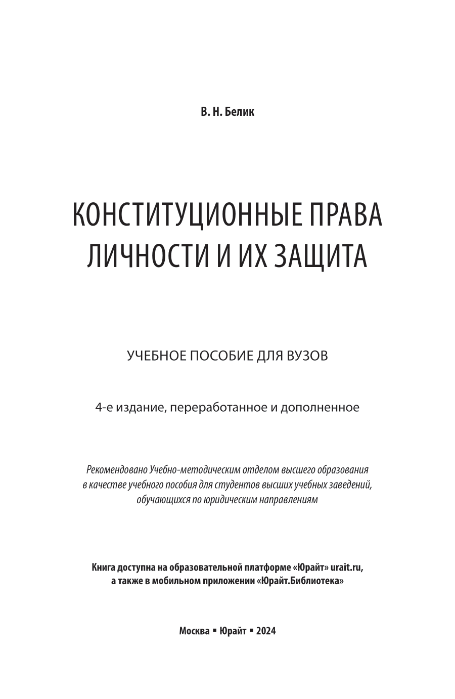 Конституционные права личности и их защита 4-е изд. пер. и доп. Учебное пособие для вузов (Валерий Николаевич Белик); ЮРАЙТ, 2024