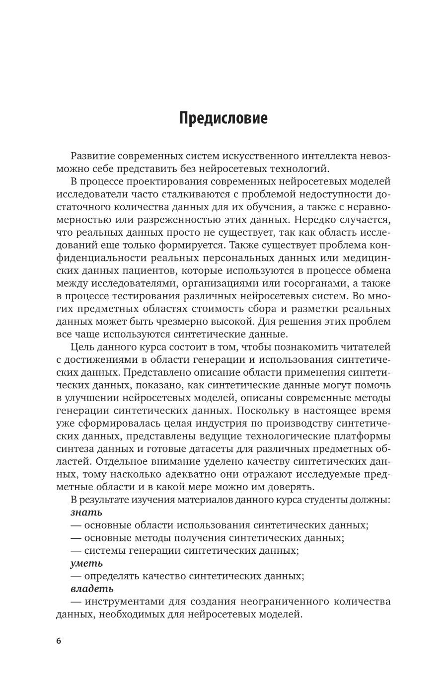 Курс знакомит с достижениями в области генерации и использования синтетических данных, которые все чаще используются для обучения современных нейросетевых моделей. В нем представлено описание области применения синтетических данных, показано, как синтетические данные могут помочь в улучшении нейросетевых моделей, описаны современные методы генерации синтетических данных. Поскольку в настоящее время уже сформировалась целая индустрия по производству синтетических данных, представлены ведущие технологические платформы синтеза данных и готовые датасеты для различных предметных областей. Отдельное внимание уделено качеству синтетических данных, тому, насколько адекватно они отражают исследуемые предметные области и в какой мере можно им доверять. Для студентов инженерно-технических направлений, изучающих современный анализ данных и искусственный интеллект, а также для специалистов в области нейросетевых технологий.