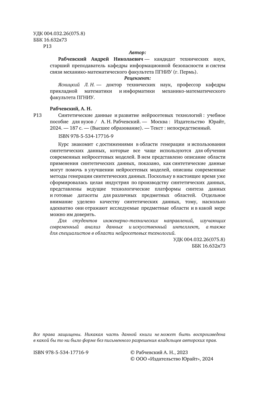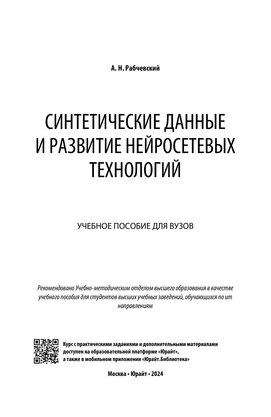 Синтетические данные и развитие нейросетевых технологий. Учебное пособие для вузов (Андрей Николаевич Рабчевский); ЮРАЙТ, 2023