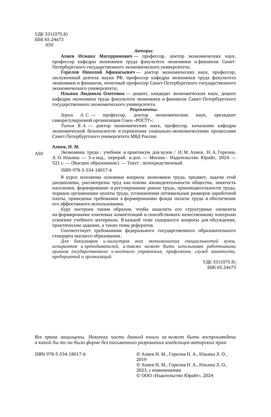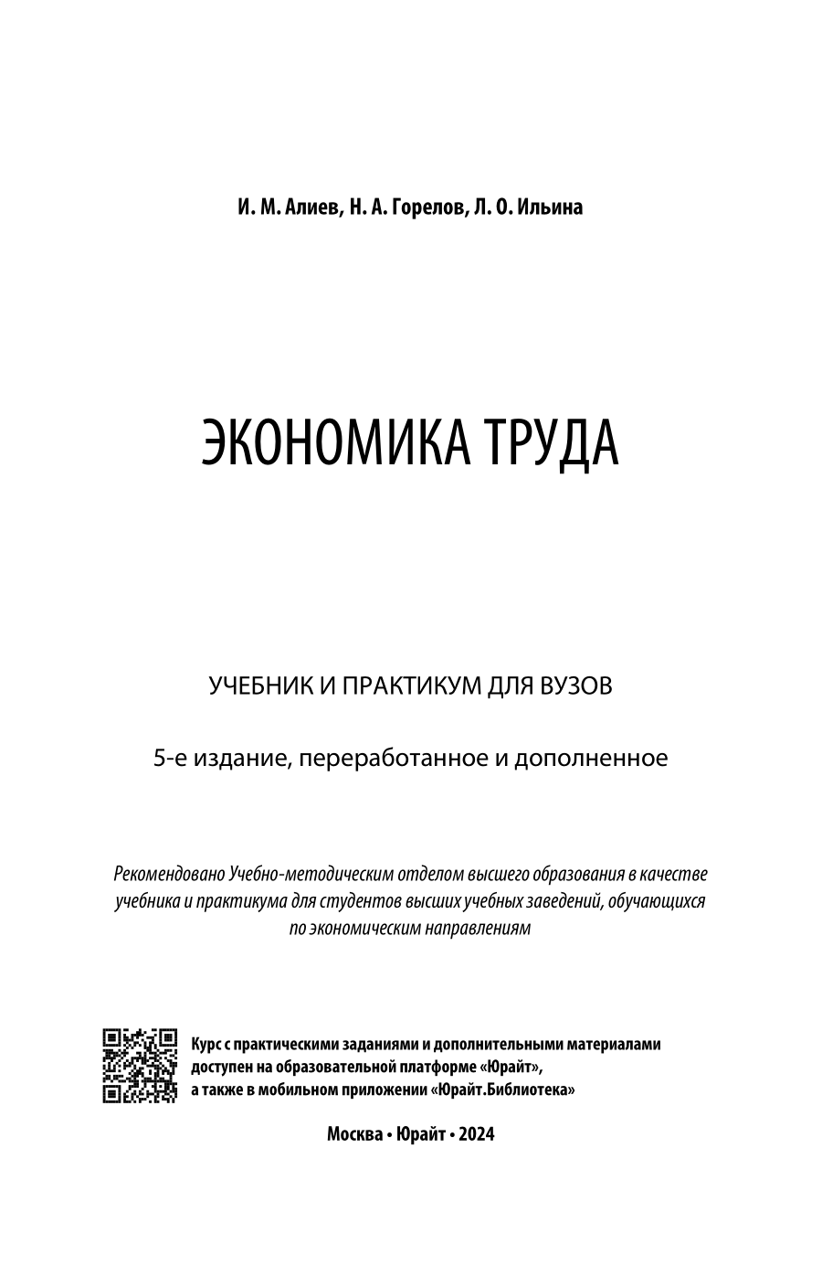 Экономика труда 5-е изд. пер. и доп. Учебник и практикум для бакалавриата и магистратуры (Алиев Исмаил Магеррамович; Горелов Николай Афанасьевич; Ильина Людмила Олеговна), 2024