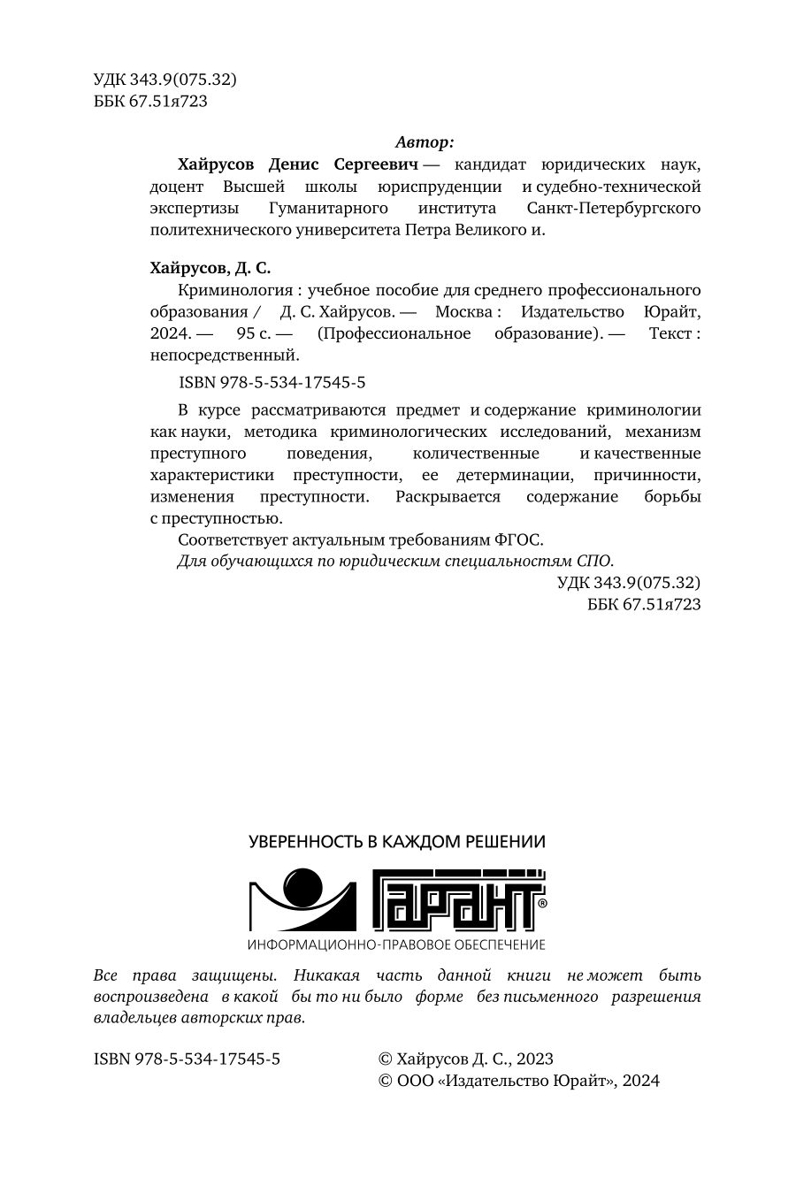 Криминология. Учебное пособие для СПО (Денис Сергеевич Хайрусов); ЮРАЙТ, 2023