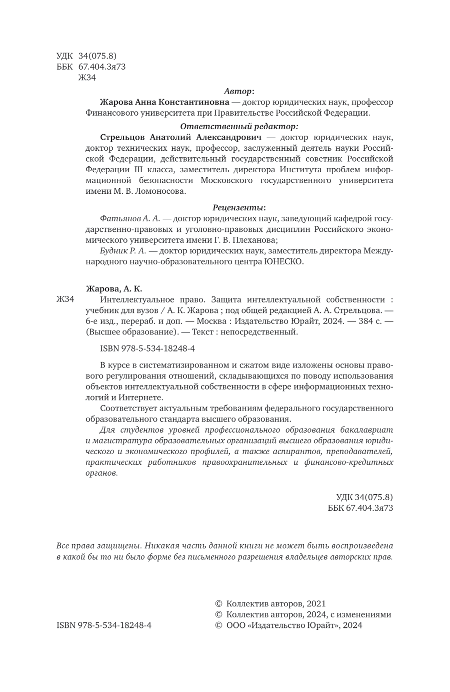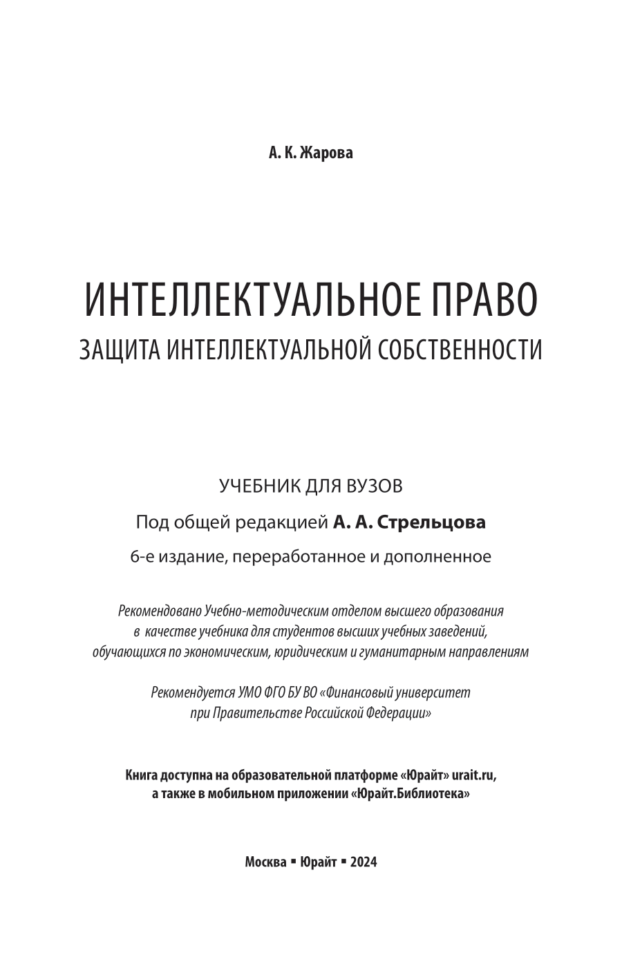 Интеллектуальное право. Защита интеллектуальной собственности 6-е изд. пер. и доп. Учебник для вузов (Анатолий Александрович Стрельцов); ЮРАЙТ, 2024