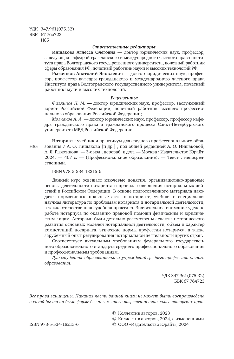 Нотариат 3-е изд. пер. и доп. Учебник и практикум для СПО (Анатолий Яковлевич Рыженков); ЮРАЙТ, 2024