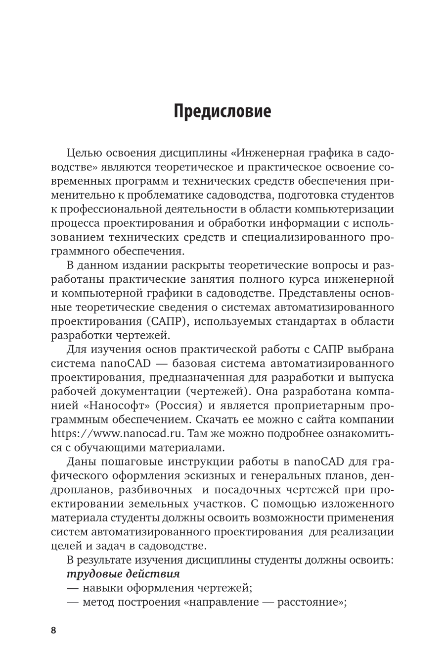 В курсе раскрыты теоретические вопросы и разработаны практические занятия полного курса инженерной и компьютерной графики в садоводстве. Представлены основные теоретические сведения о системах автоматизированного проектирования, используемых стандартах в области разработки чертежей. Даны пошаговые инструкции работы в системе автоматизированного проектирования nanoCAD для графического оформления эскизных и генеральных планов, дендропланов, разбивочных и посадочных чертежей при проектировании земельных участков. Для студентов образовательных учреждений среднего профессионального образования, обучающихся по направлениям «Садоводство», «Ландшафтная архитектура».