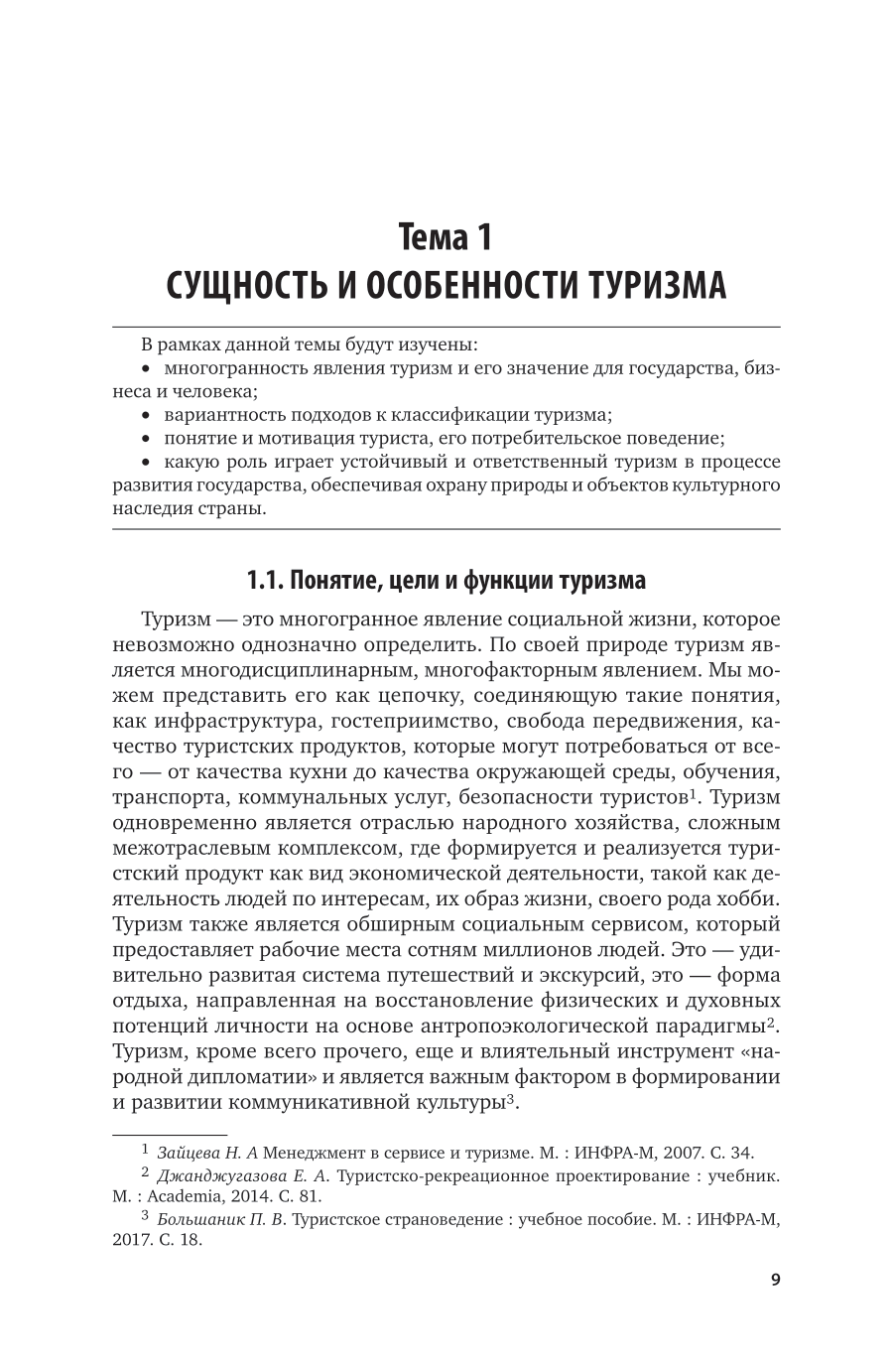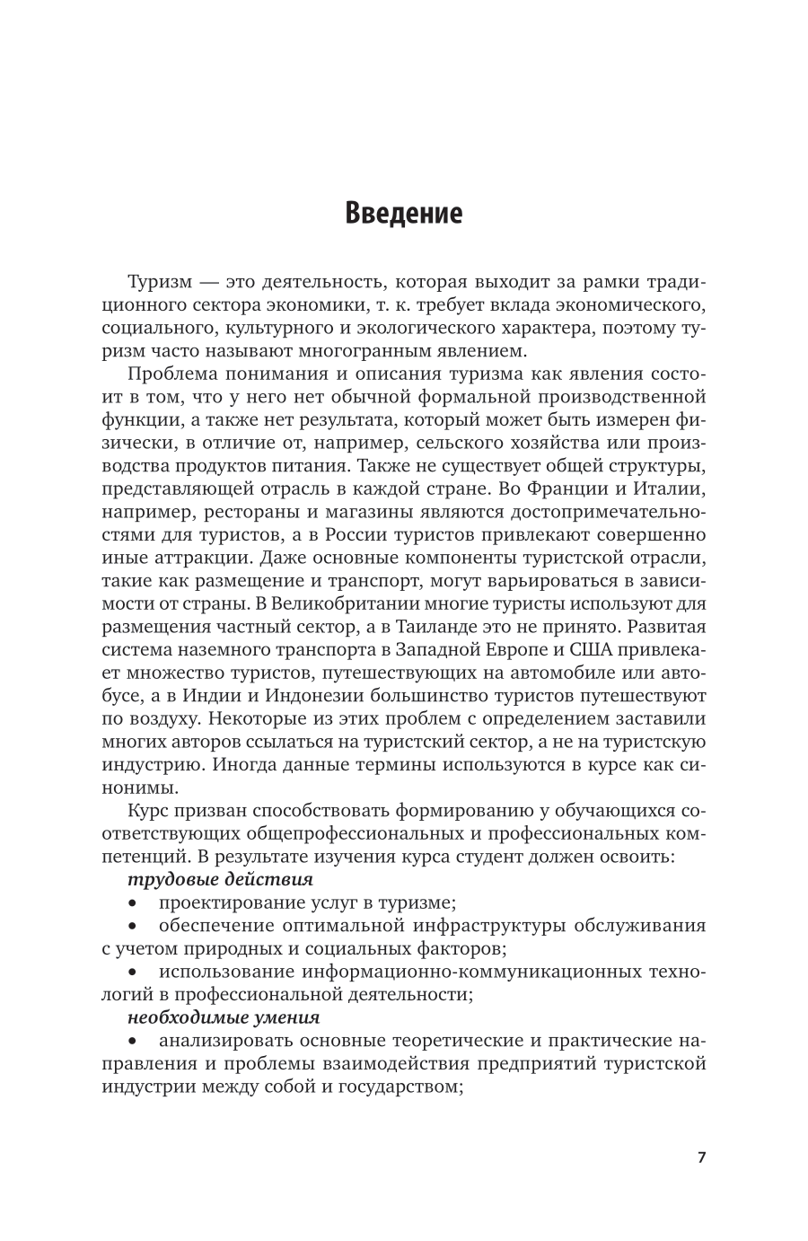 Данный курс призван обеспечить всестороннее введение в сферу туризма с целью стимулирования дальнейшего интереса к данной предметной области. В нем переплетены вопросы теоретического характера и практической организации туристской деятельности. Затронуты аспекты сущностного подхода к туризму и его классификации, к понятию туриста и его поведения и мотивации, роли и влияния туризма на общество, природную и культурную среды; выделены вопросы государственного участия и влияния; отражены вопросы кластерного подхода к развитию туризма и формированию конкурентоспособных дестинаций. Отдельные темы посвящены инфраструктуре туризма и туристкой деятельности. Соответствует актуальным требованиям федерального государственного образовательного стандарта среднего профессионального образования и профессиональным требованиям. Для студентов образовательных учреждений среднего профессионального образования.