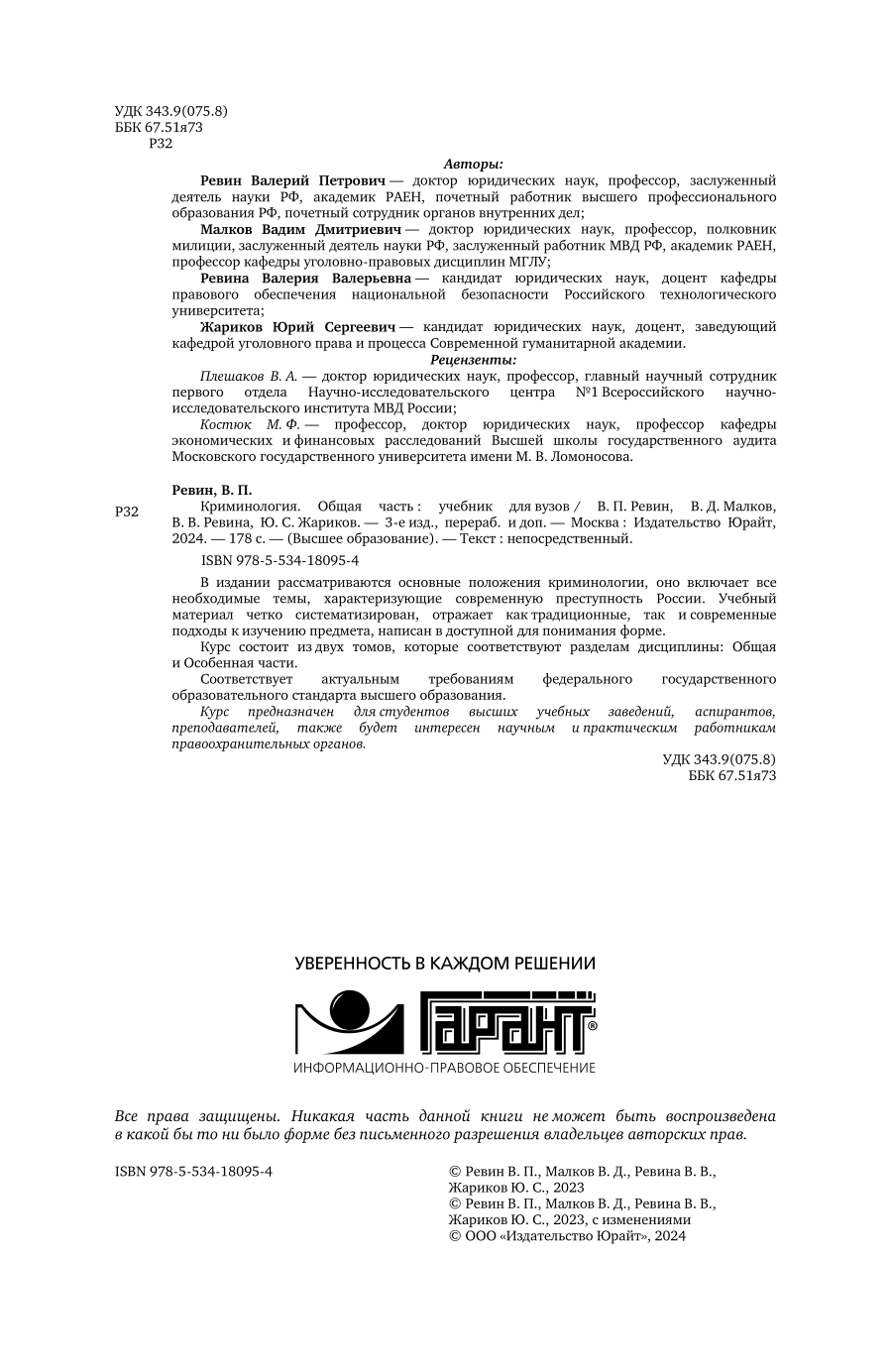 Криминология. Общая часть 3-е изд. пер. и доп. Учебник для вузов (Ревин Валерий Петрович, Малков Вадим Дмитриевич, Ревина Валерия Валерьевна, Жариков Юрий Сергеевич), 2023