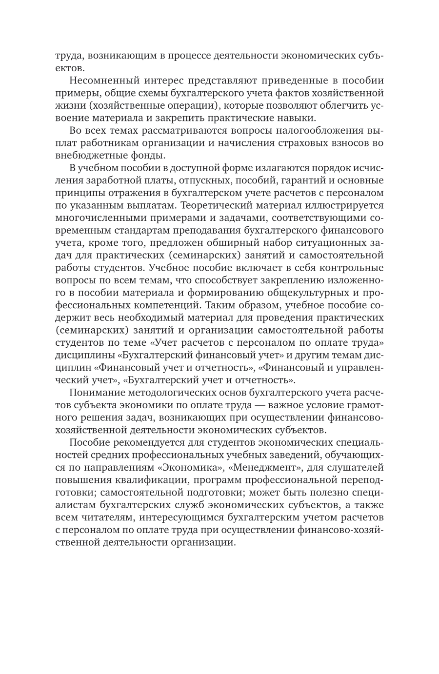 Учебное пособие предназначено для самостоятельного изучения теоретических и практических основ бухгалтерского финансового учета расчетов с персоналом по оплате труда. В книге в доступной форме излагаются порядок исчисления заработной платы, отпускных, пособий, гарантий, а также основные принципы отражения в бухгалтерском учете расчетов с персоналом по указанным выплатам. Бухгалтерский учет расчетов по оплате труда подробно рассмотрен на различных примерах, что поможет студентам разобраться в сложных аспектах изучаемой темы. В издание включен практикум, содержащий контрольные вопросы и ситуационные задачи для практических (семинарских) занятий и самостоятельной работы студентов, что способствует закреплению изложенного в учебнике материала и формированию общекультурных и профессиональных компетенций. Соответствует актуальным требованиям Федерального государственного образовательного стандарта среднего профессионального образования и профессиональным требованиям. Для студентов образовательных учреждений среднего профессионального образования.