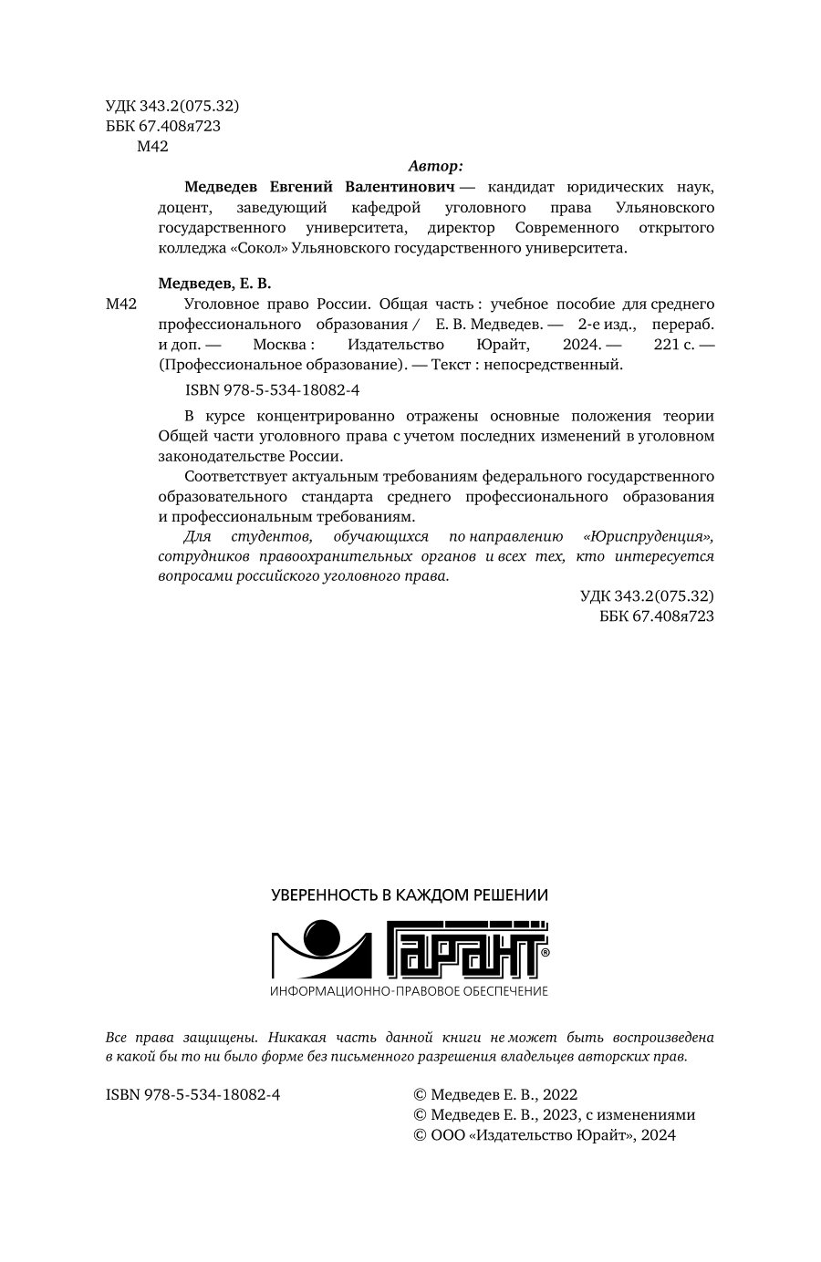 Уголовное право России. Общая часть 2-е изд. пер. и доп. Учебное пособие для СПО (Евгений Валентинович Медведев); ЮРАЙТ, 2023