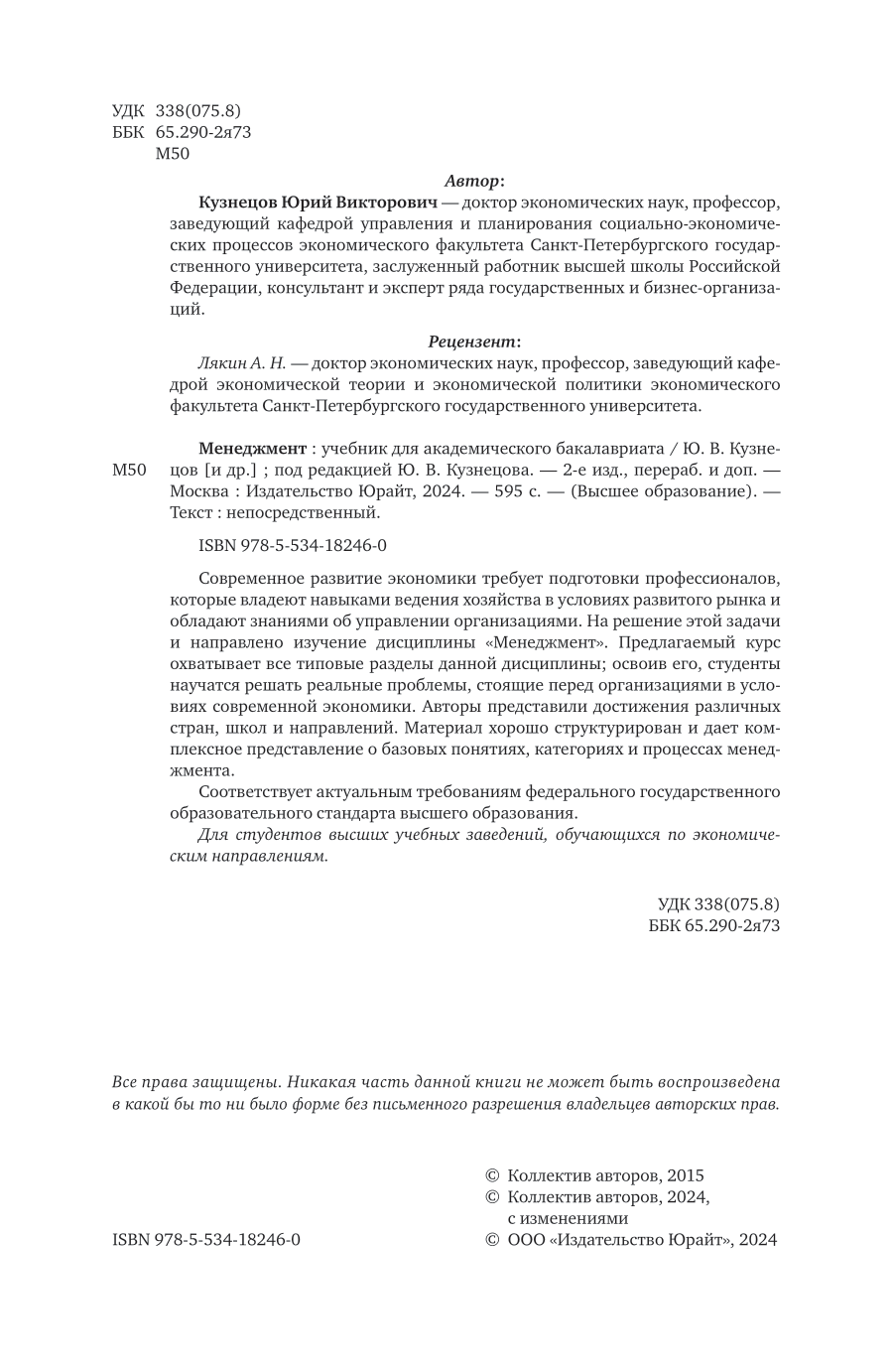 Современное развитие экономики требует подготовки профессионалов, которые владеют навыками ведения хозяйства в условиях развитого рынка и обладают знаниями об управлении организациями. На решение этой задачи и направлено изучение дисциплины «Менеджмент». Предлагаемый курс охватывает все типовые разделы данной дисциплины; освоив его, студенты научатся решать реальные проблемы, стоящие перед организациями в условиях современной экономики. Авторы представили достижения различных стран, школ и направлений. Материал хорошо структурирован и дает комплексное представление о базовых понятиях, категориях и процессах менеджмента. Соответствует актуальным требованиям федерального государственного образовательного стандарта высшего образования. Для студентов высших учебных заведений, обучающихся по экономическим направлениям.