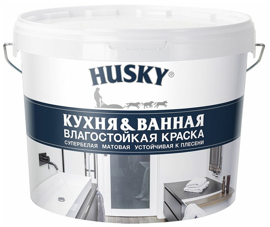 HUSKY Kitchen and Bathroom - Краска для кухонь и ванных комнат. Супербелая матовая, устойчивая к плесени, влагостойкая краска для стен и потолков во влажных и сухих помещениях. Применяется для окраски бетонных, цементных, оштукатуренных и кирпичных поверхностей, влагостойкого гипсокартона и обоев под покраску. Выдерживает легкую влажную уборку, но не ранее, чем через 2 недели после окраски.