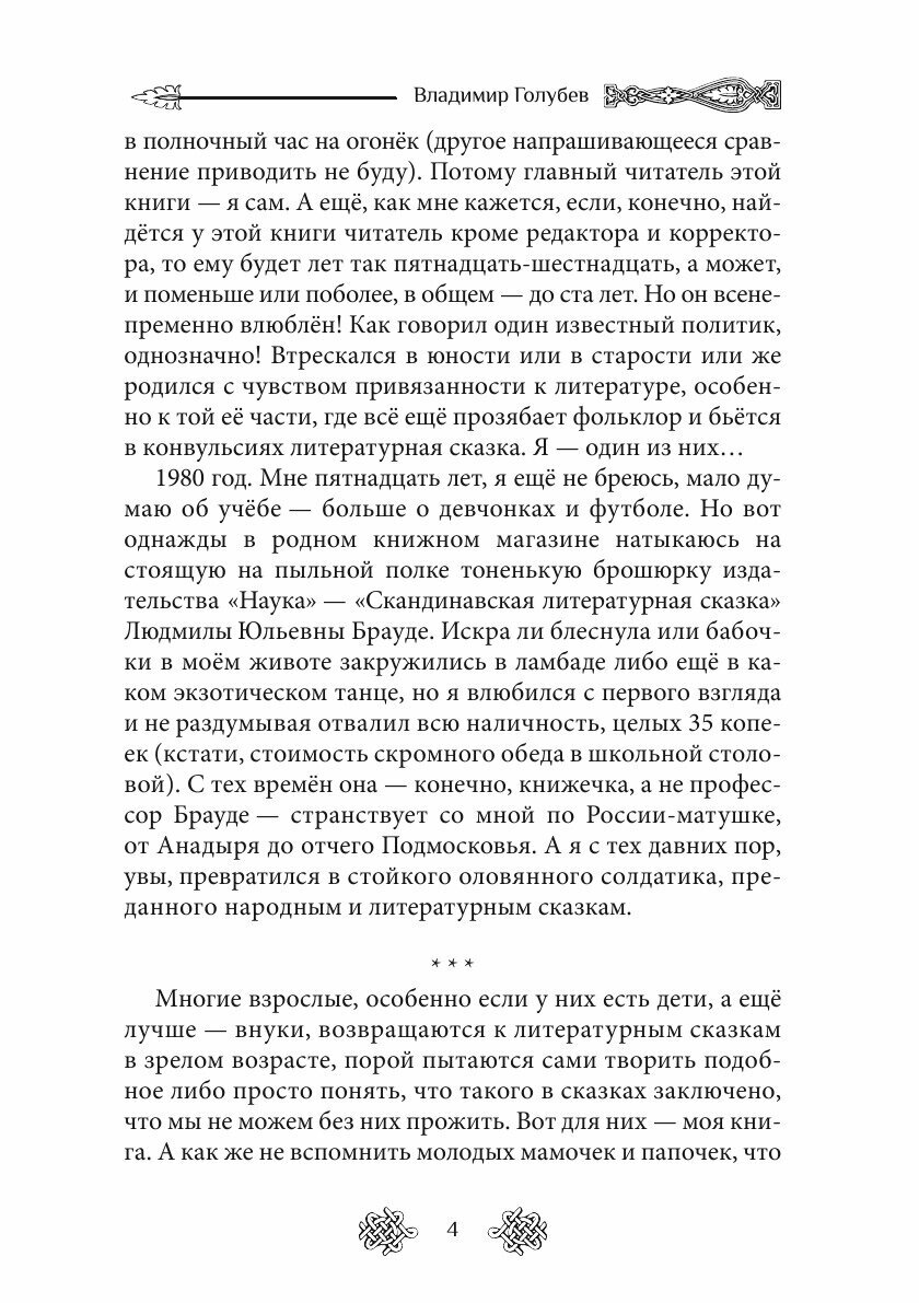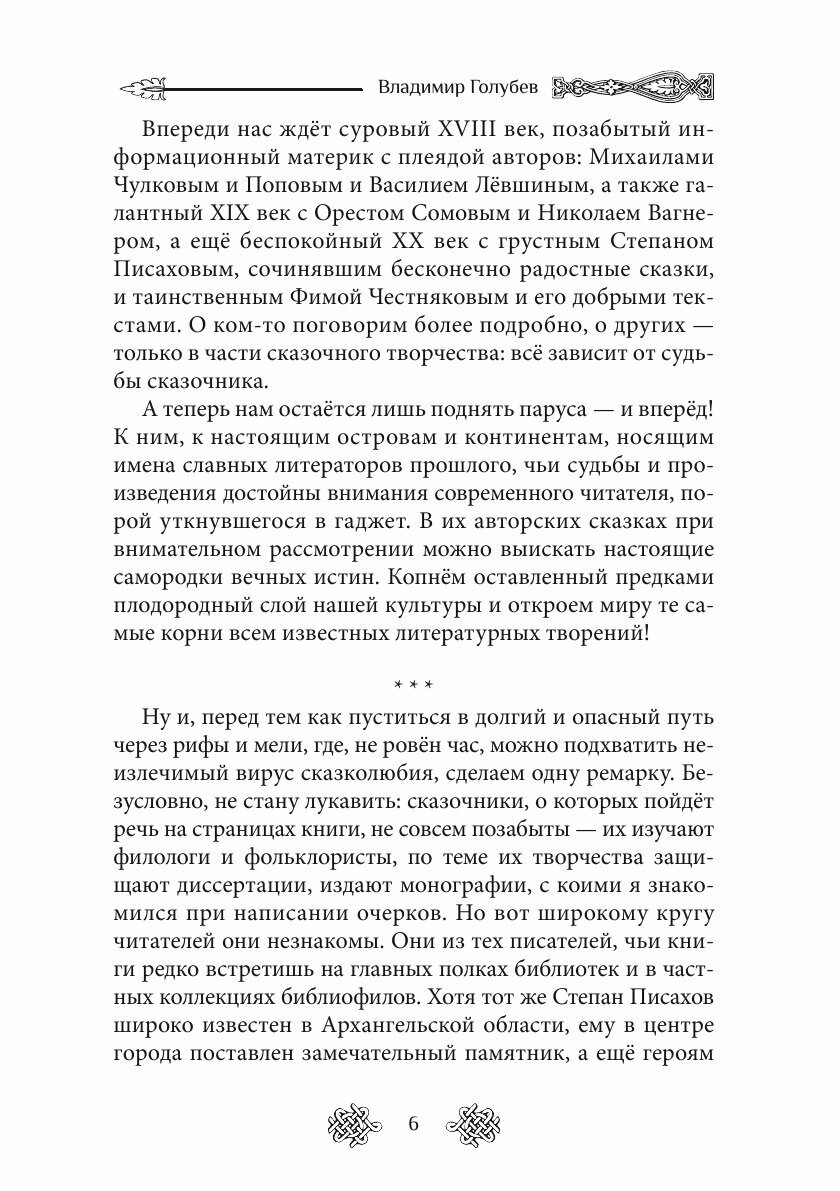 Казалось бы, кому в наше прагматичное время нужны сказки, когда есть, скажем, фэнтези? Однако сказки нужны всем, от мала до велика. Детям - чтобы научиться отличать добро от зла, расти, прикасаясь к корням. Взрослым - чтобы возвращаться в мир детства, расширять кругозор, не забывать о наследии предков. К тому же не всякая сказка примитивна и проста, уверяет нас автор. Из сказок вырос и жанр фэнтези, в чем вы убедитесь, дочитав книгу до конца, и узнаете о нелегких судьбах русских сказочников, бережно сохранявших и развивавших жанр русской литературной сказки, о ее истоках и развитии. Книга В. Голубева будет интересна и простым читателям, и литературоведам - в общем, всем, кому небезразлично наше литературное наследие.