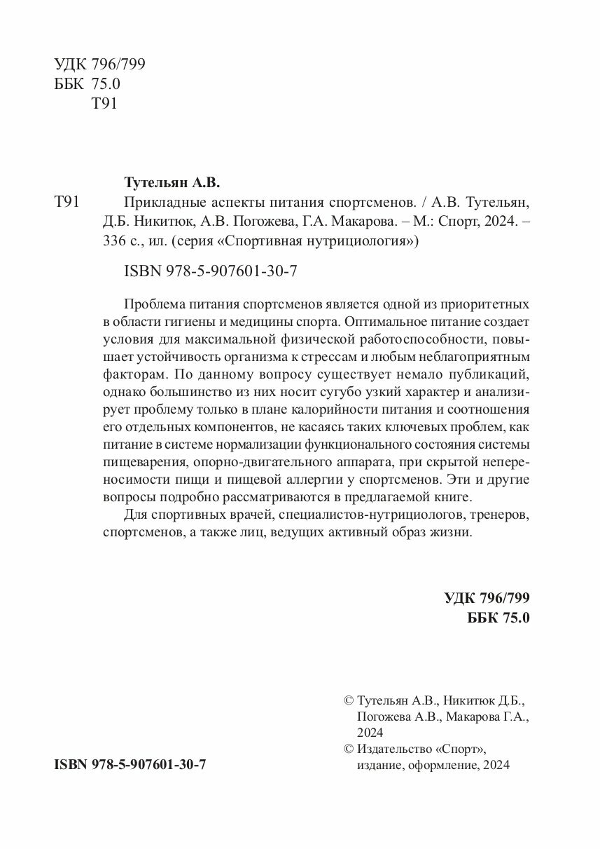 Прикладные аспекты питания спортсменов (Тутельян Алексей Викторович; Никитюк Дмитрий Борисович; Макарова Галина Александровна); Спорт, 2024