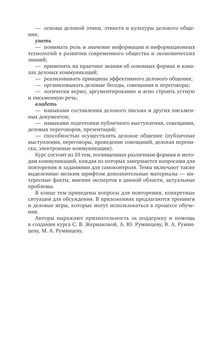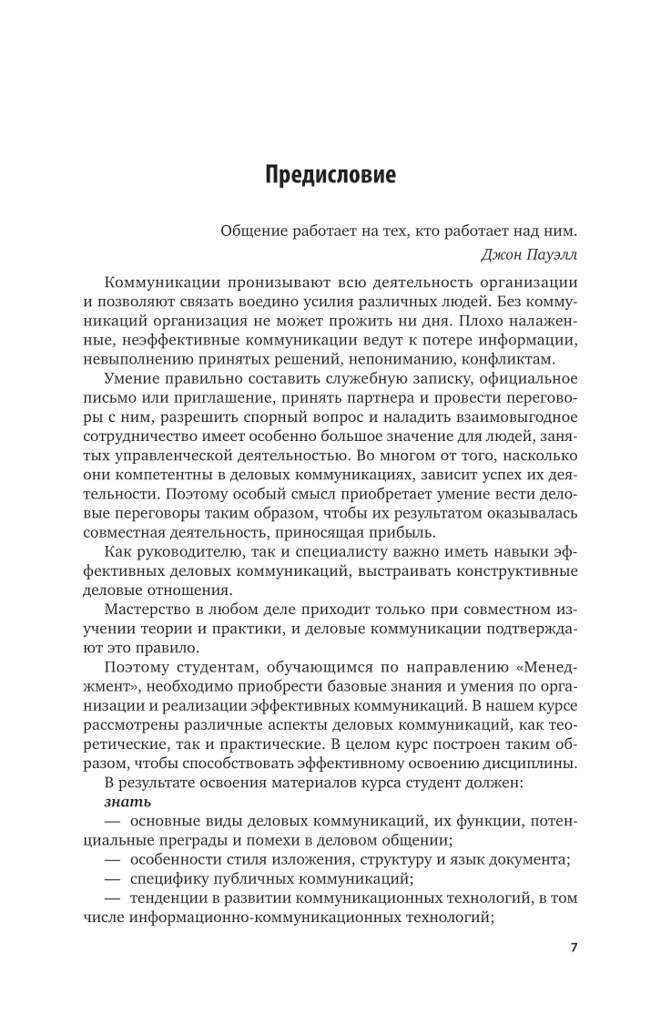 В курсе рассмотрен широкий круг вопросов, касающихся организации и реализации коммуникаций в процессе управления, в том числе виды общения, функции деловых коммуникаций, вопросы создания документов, деловых писем, презентаций, выступлений перед аудиторией; организации деловых переговоров и совещаний. Особое внимание уделено этике, этикету и культуре делового общения. Рассмотрены современные тенденции в развитии коммуникационных технологий, критерии оценки эффективности коммуникаций, современные системы управления коммуникациями - PR, коммуникации между организациями и властью, коммуникации с инвесторами. Соответствует федеральному государственному образовательному стандарту высшего образования. Для студентов высших учебных заведений, обучающихся по экономическим, социально-экономическим направлениям, преподавателей, практических работников в области управления организациями.