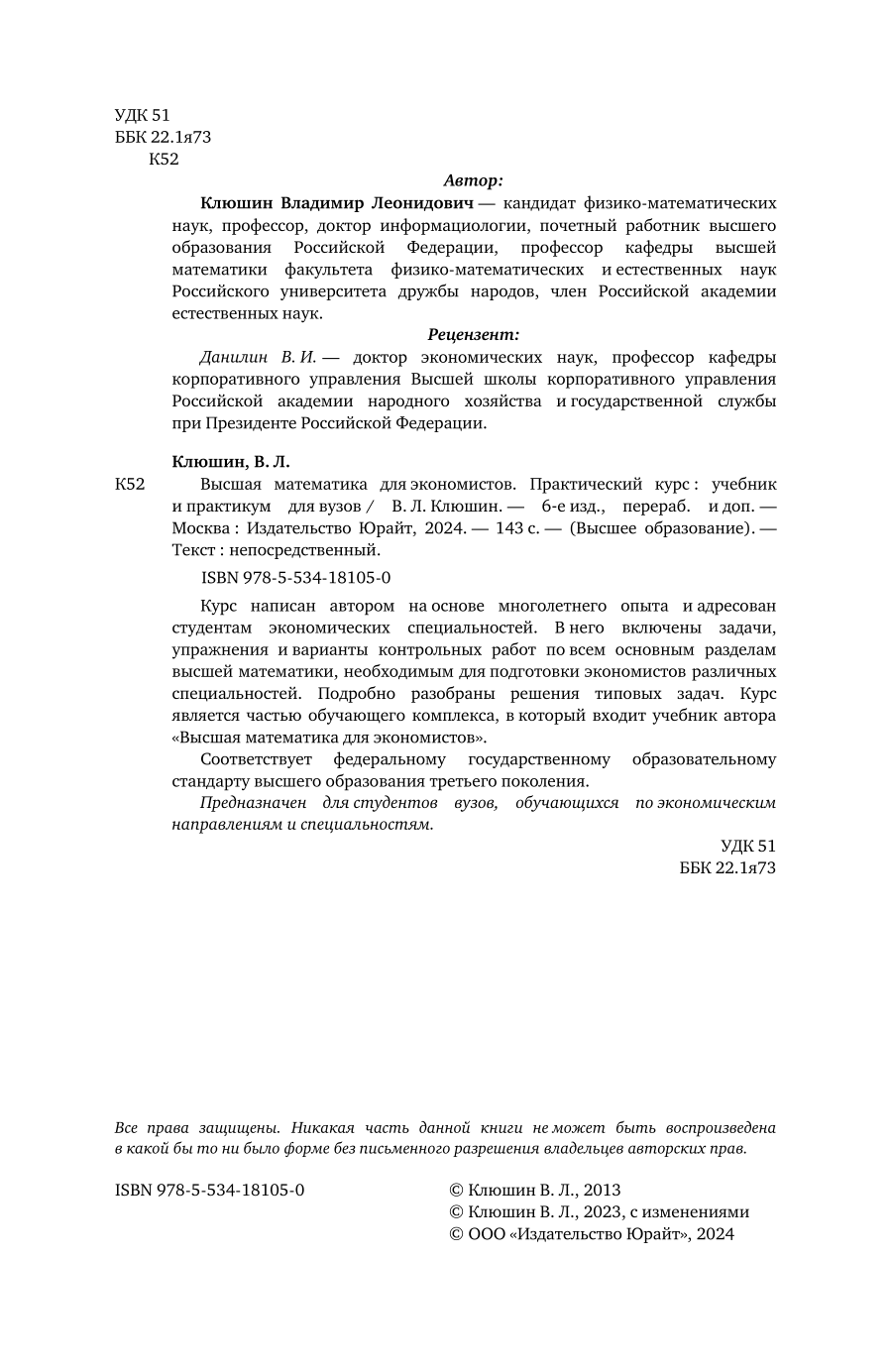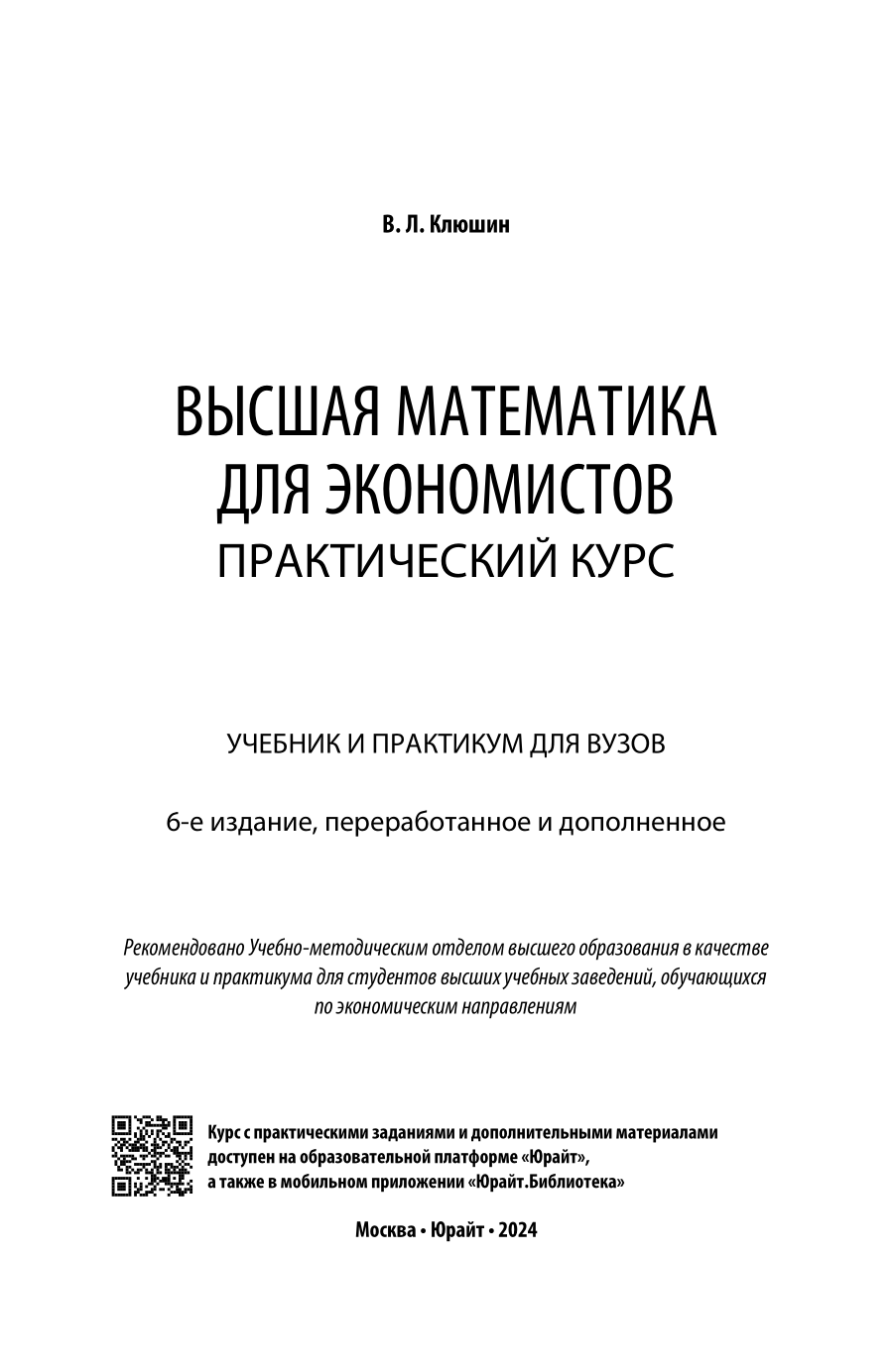 Высшая математика для экономистов. Практический курс 6-е изд. пер. и доп. Учебник и практикум для вузов (Владимир Леонидович Клюшин); ЮРАЙТ, 2023