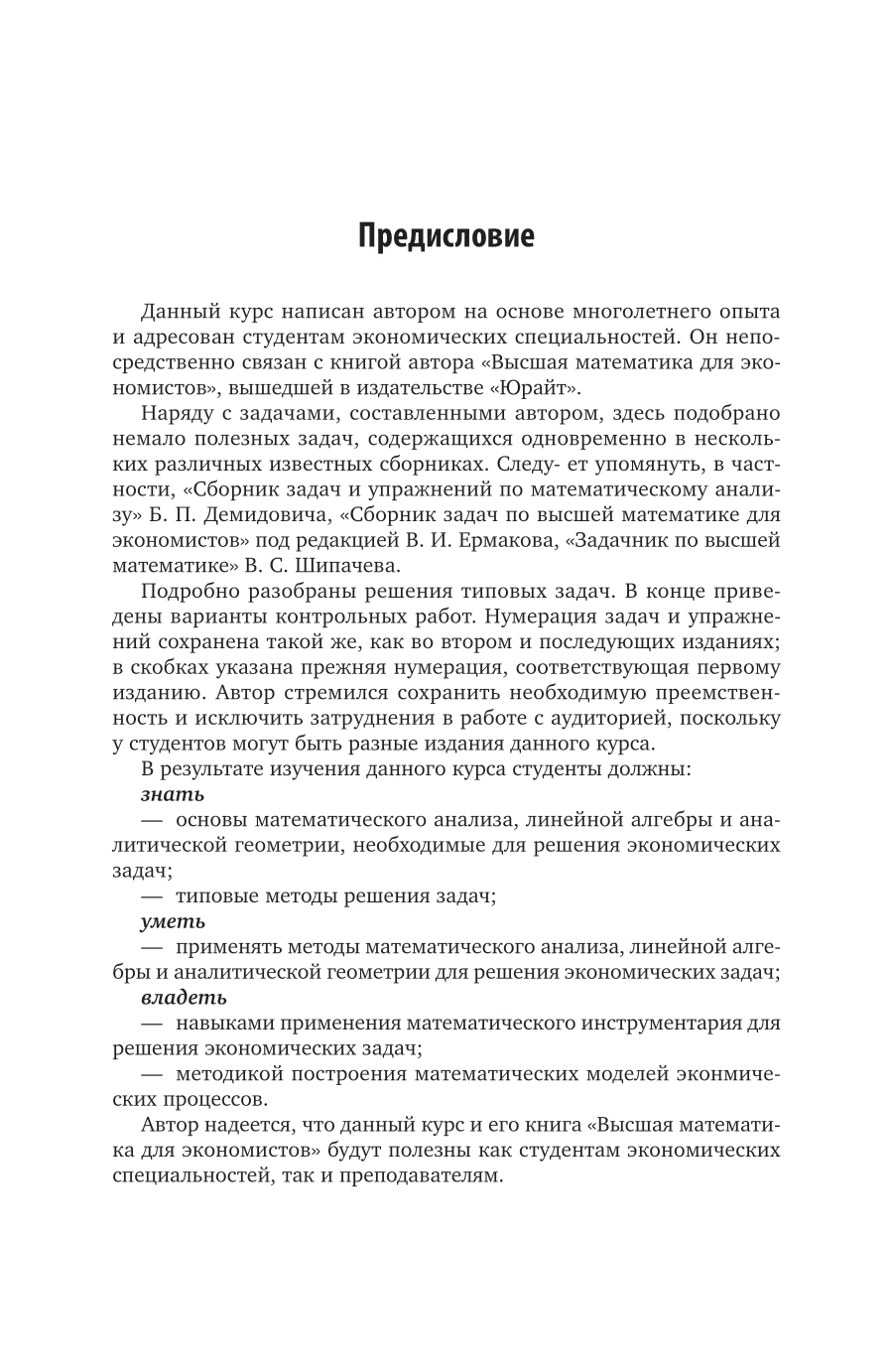 Курс написан автором на основе многолетнего опыта и адресован студентам экономических специальностей. В него включены задачи, упражнения и варианты контрольных работ по всем основным разделам высшей математики, необходимым для подготовки экономистов различных специальностей. Подробно разобраны решения типовых задач. Курс является частью обучающего комплекса, в который входит учебник автора «Высшая математика для экономистов». Соответствует федеральному государственному образовательному стандарту высшего образования третьего поколения. Предназначен для студентов вузов, обучающихся по экономическим направлениям и специальностям.