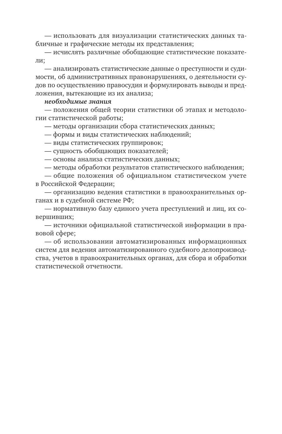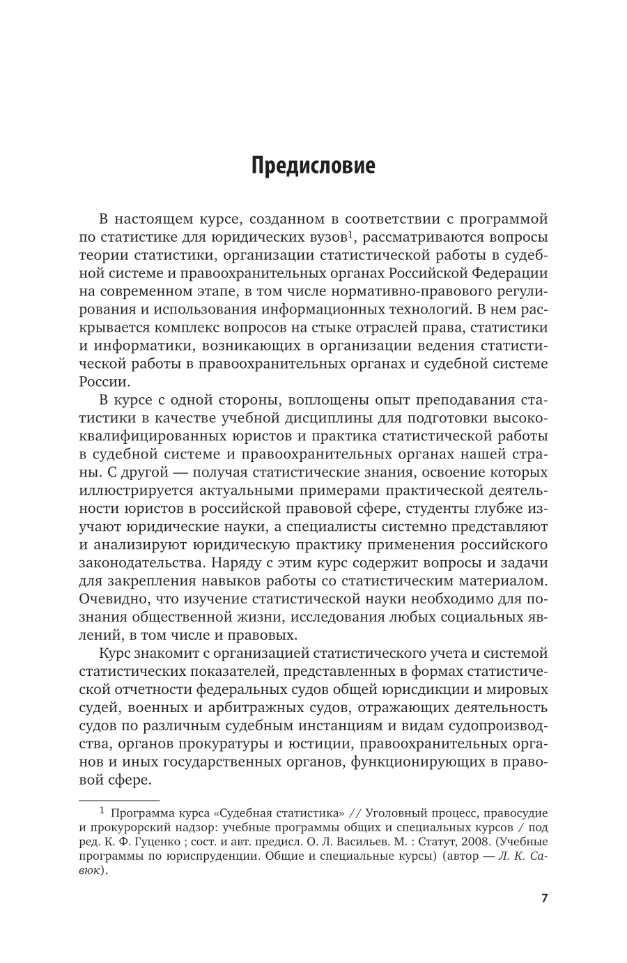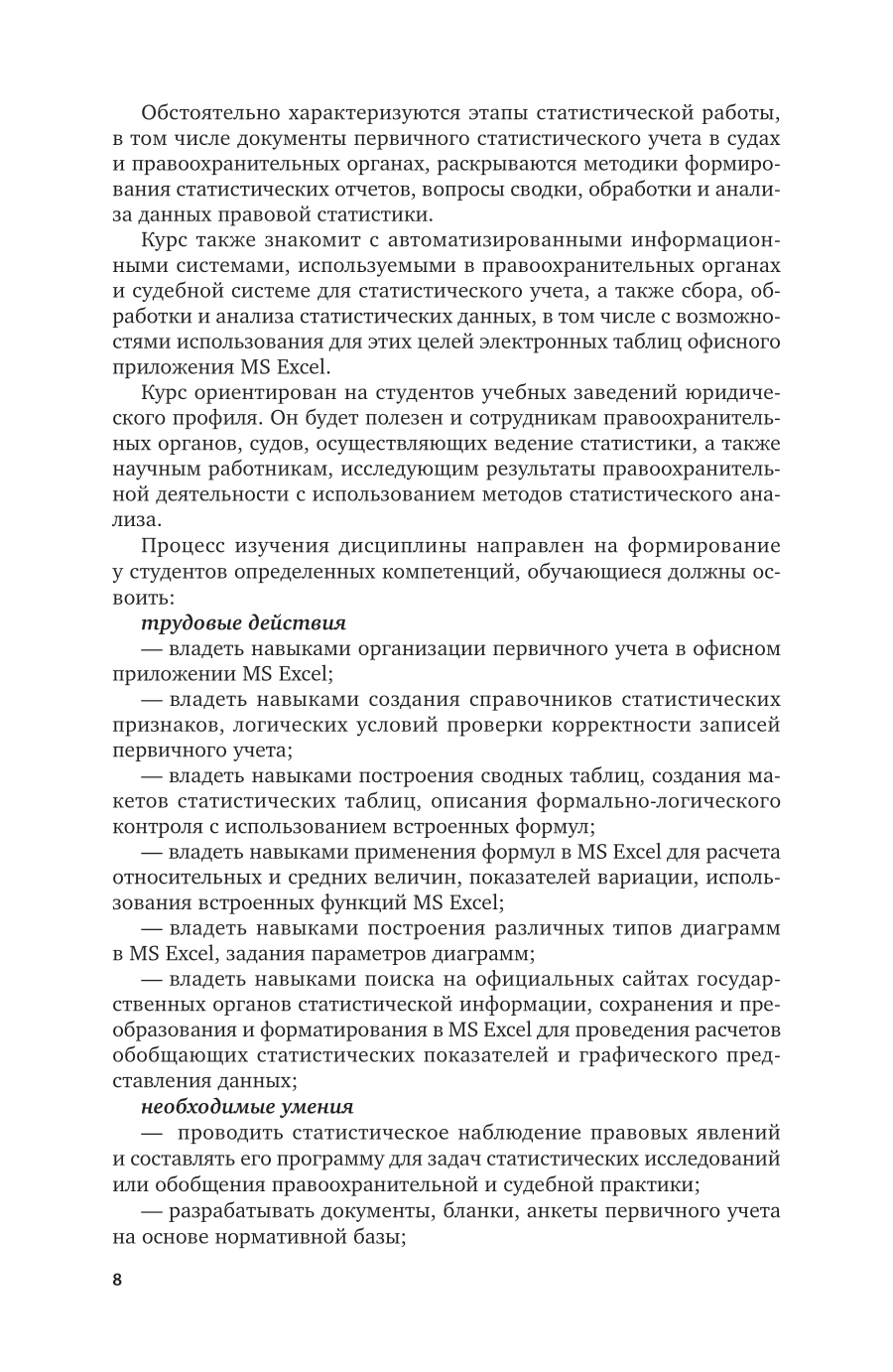 Курс подготовлен с учетом наиболее полных учебных программ по правовой статистике и включает в себя два раздела. В первом разделе излагаются основы теории статистики, ее методы. Во втором разделе вопросы теории статистики рассматриваются в ракурсе практической реализации ведения статистики в правоохранительных органах, органах юстиции и судебной системе. Значительное внимание уделено вопросам статистического учета правоохранительными органами и судами общей юрисдикции преступлений и лиц, их совершивших, судимости; использованы официальные данные статистической информации. Соответствует актуальным требованиям Федерального государственного образовательного стандарта среднего профессионального образования. Для студентов образовательных учреждений среднего профессионального образования, обучающихся по юридическим специальностям.