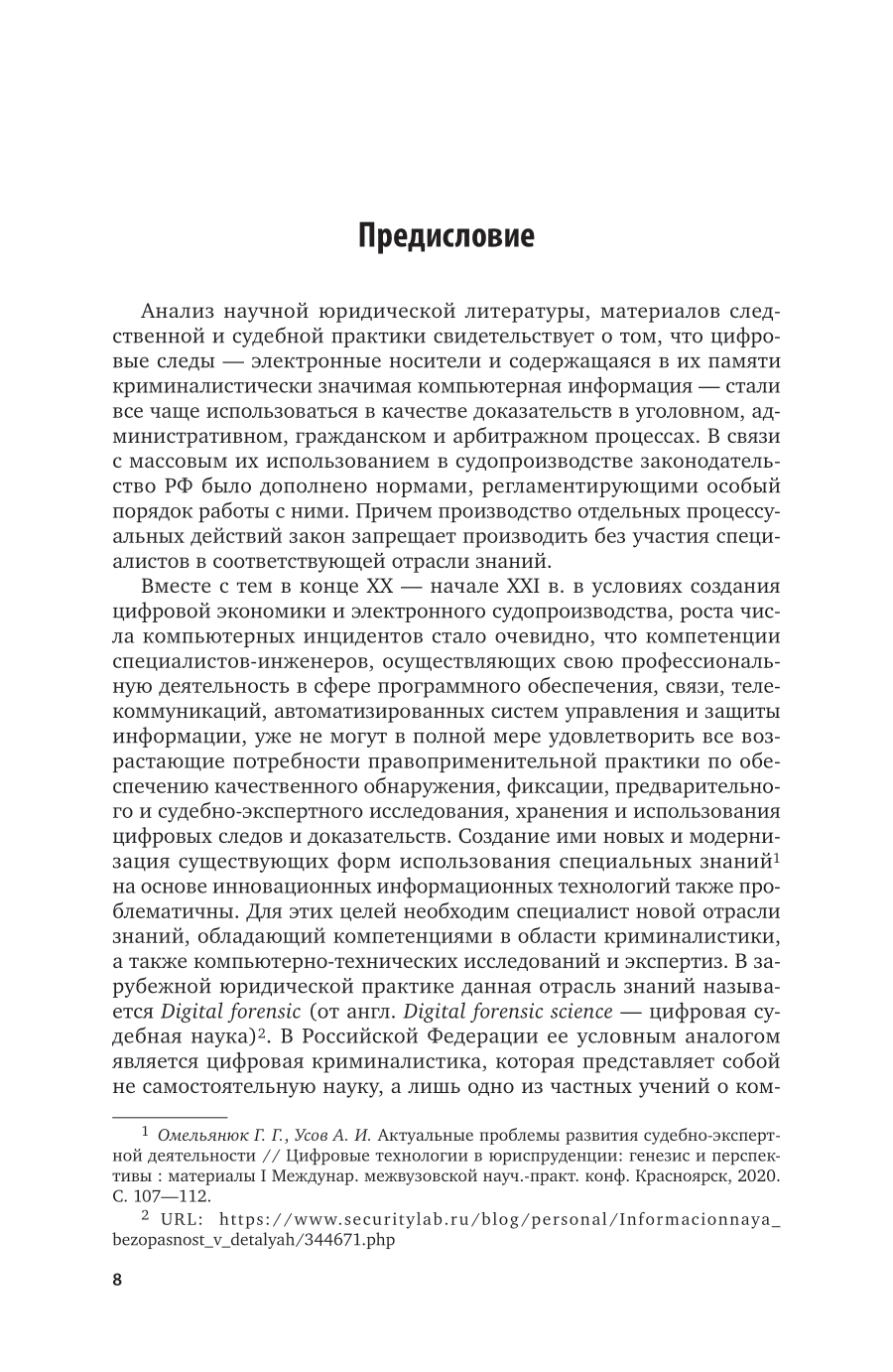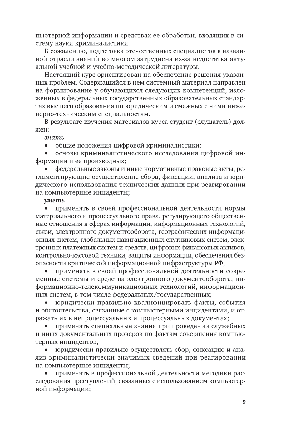 Базовый курс по блоку инновационных криминалистических дисциплин, ориентированных на подготовку специалистов юридического профиля для противодействия правонарушениям, совершаемым в условиях создания и развития цифровой экономики. Методологически обоснованы концептуальные положения криминалистического исследования цифровой информации, ее производных, средств обработки и защиты. С позиций криминалистической техники и тактики раскрыты особенности обнаружения, фиксации, предварительного исследования и последующего использования цифровых следов. Рассмотрены современные информационные технологии, применяемые в деятельности правоохранительных органов для обеспечения борьбы с правонарушениями. Курс подготовлен на основе новейших тенденций развития криминалистики; учитывает новеллы действующего российского законодательства, а также многолетний опыт практики работы с электронными доказательствами в уголовном, административном, гражданском и арбитражном судопроизводстве. Соответствует актуальным требованиям федерального государственного образовательного стандарта высшего образования. Для бакалавриата, специалитета, магистратуры и аспирантуры (адъюнктуры) юридических и инженерно-технических вузов и факультетов, а также практических работников правоприменительных органов.