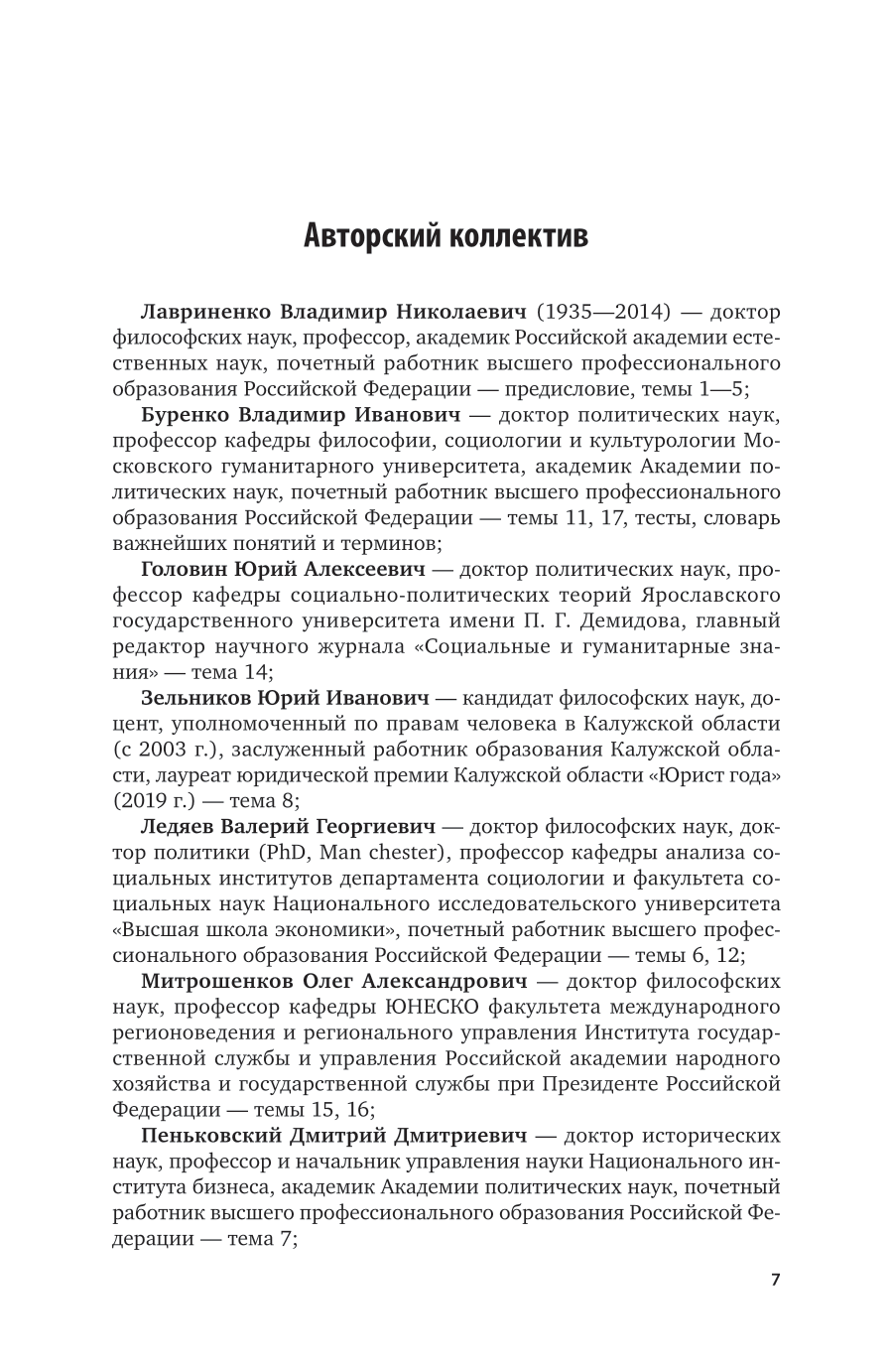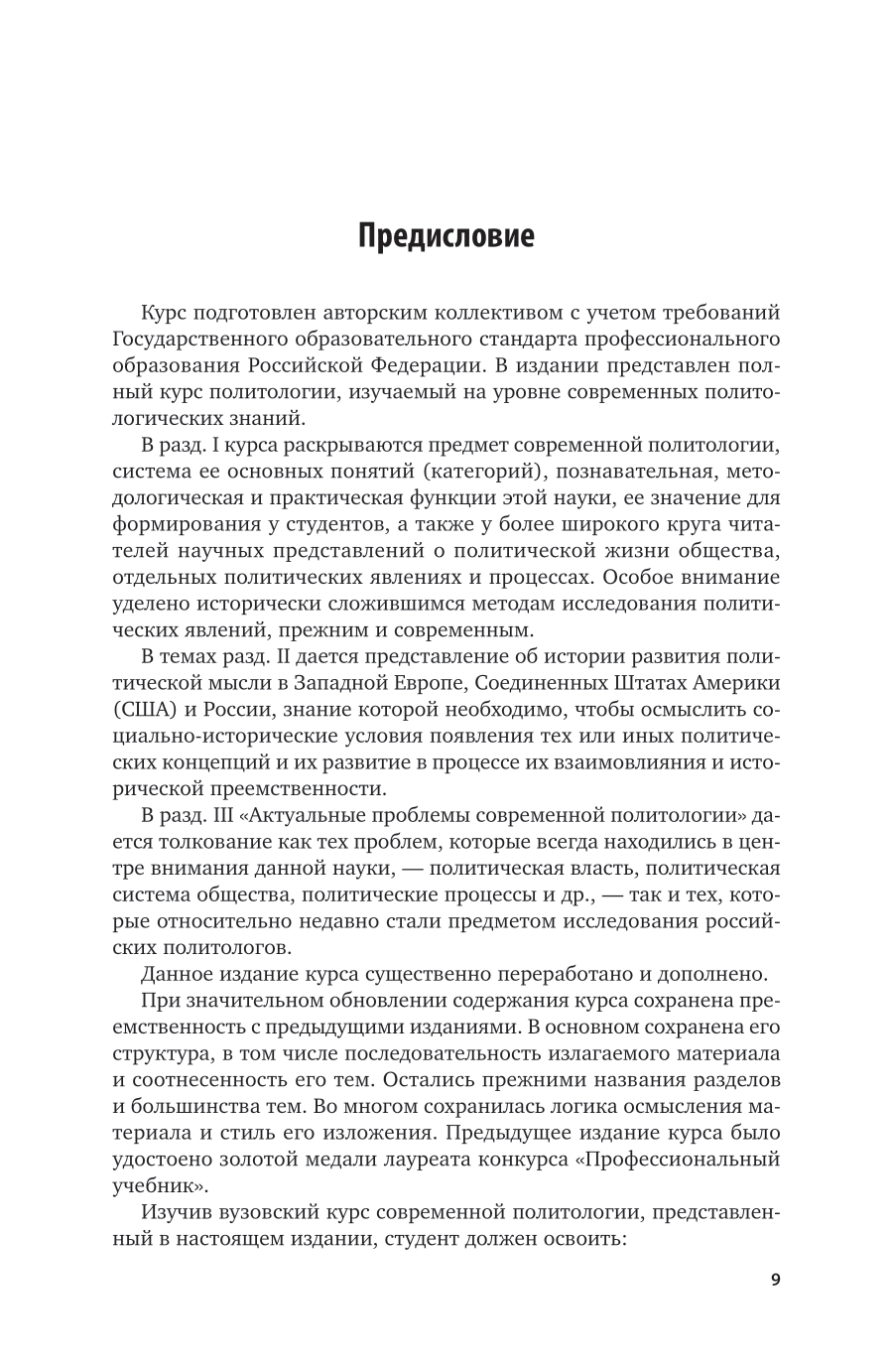 В курсе в доступной для понимания форме изложен полный курс политологии. Авторами рассмотрены основные понятия (категории) политологии, ее общетеоретические и методологические проблемы. Значительное внимание уделено истории развития политической мысли и актуальным проблемам современной политической науки. Дается глубокое исследование политической системы общества и ее основных институтов, политических процессов, партий и партийных систем, политических элит, лидерства. Рассмотрены также особенности прикладной политологии и политические технологии.