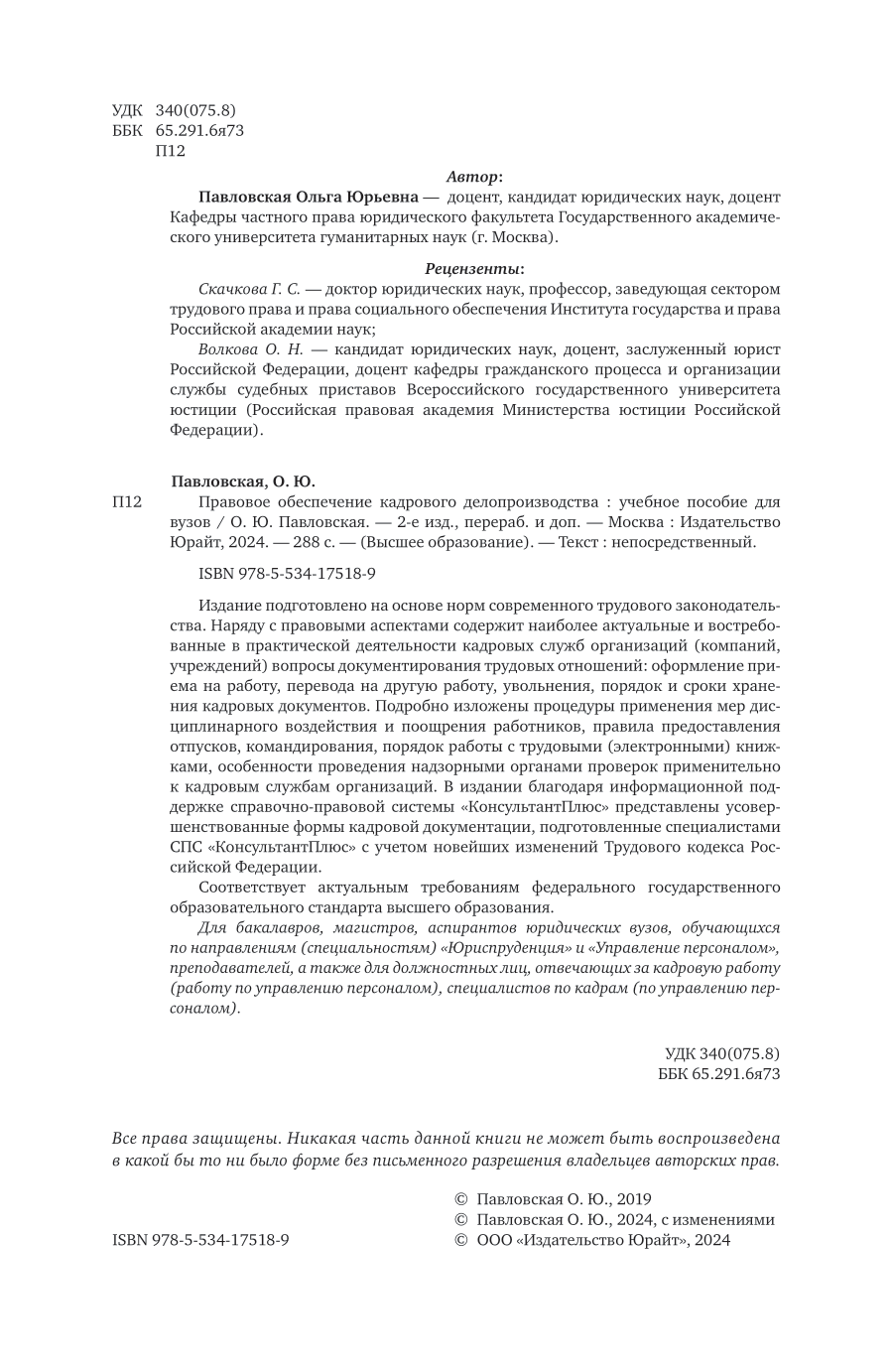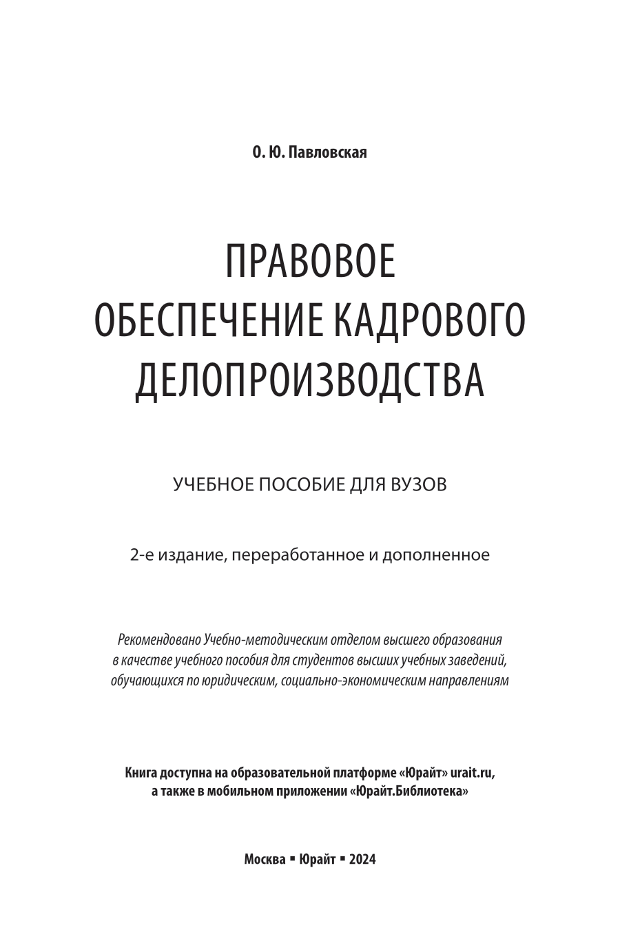 Правовое обеспечение кадрового делопроизводства 2-е изд. пер. и доп. Учебное пособие для вузов (Ольга Юрьевна Павловская); ЮРАЙТ, 2024