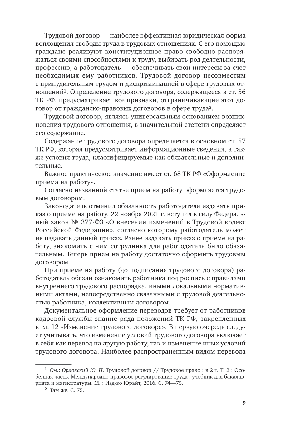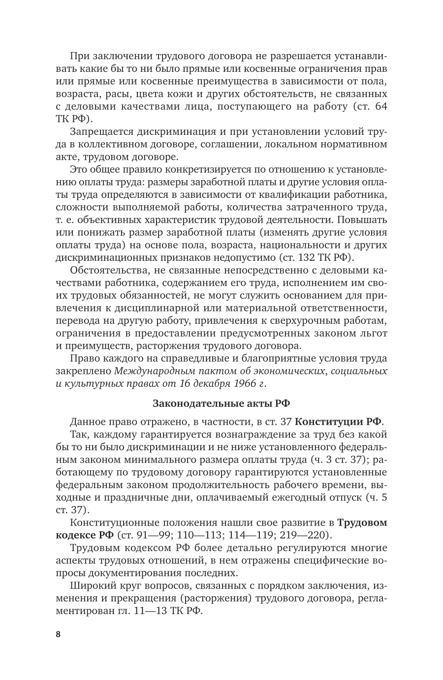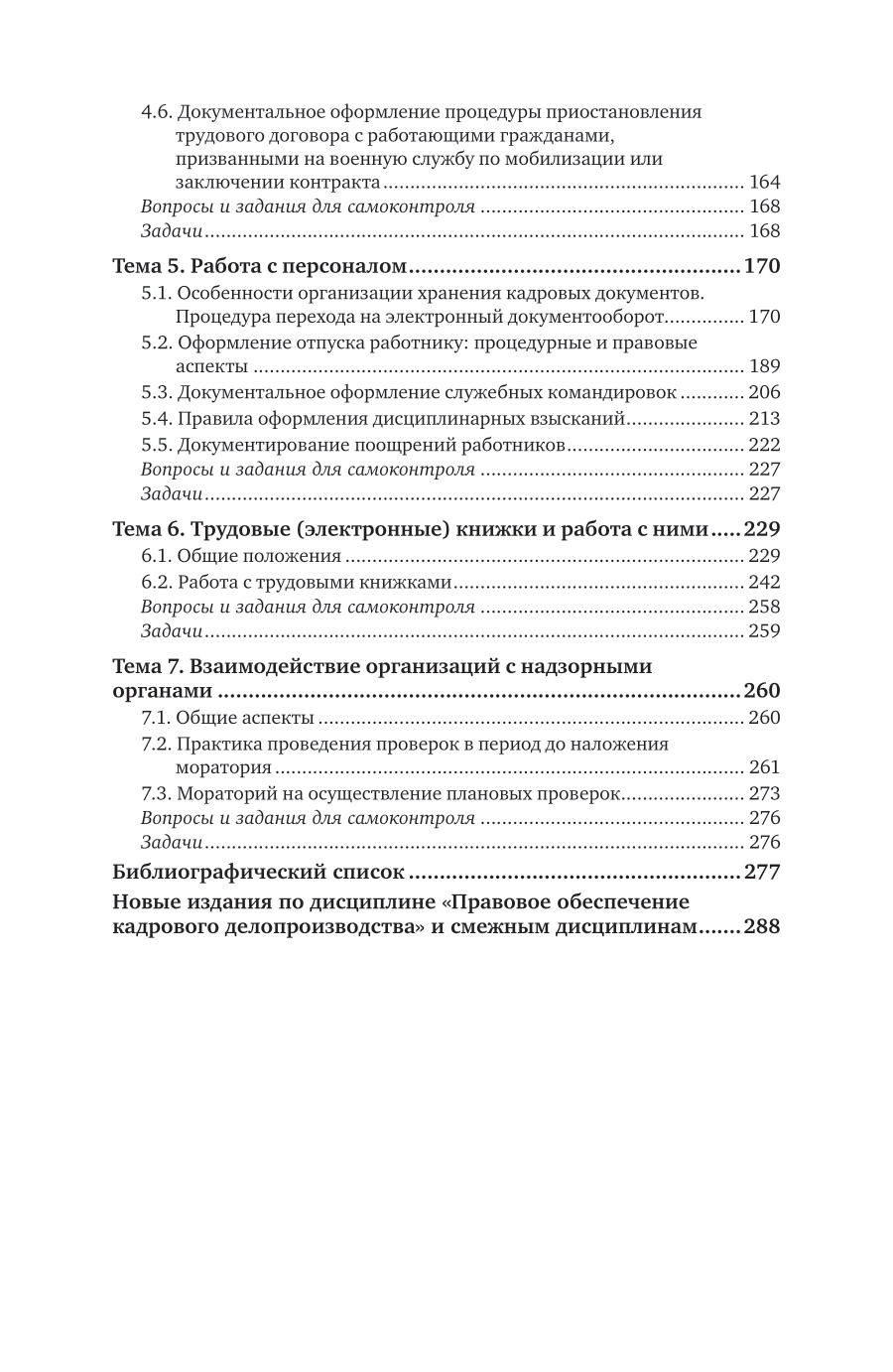Издание подготовлено на основе норм современного трудового законодательства. Наряду с правовыми аспектами содержит наиболее актуальные и востребованные в практической деятельности кадровых служб организаций (компаний, учреждений) вопросы документирования трудовых отношений: оформление приема на работу, перевода на другую работу, увольнения, порядок и сроки хранения кадровых документов. Подробно изложены процедуры применения мер дисциплинарного воздействия и поощрения работников, правила предоставления отпусков, командирования, порядок работы с трудовыми (электронными) книжками, особенности проведения надзорными органами проверок применительно к кадровым службам организаций. В издании благодаря информационной поддержке справочно-правовой системы «КонсультантПлюс» представлены усовершенствованные формы кадровой документации, подготовленные специалистами СПС «КонсультантПлюс» с учетом новейших изменений Трудового кодекса Российской Федерации. Соответствует актуальным требованиям федерального государственного образовательного стандарта высшего образования. Для бакалавров, магистров, аспирантов юридических вузов, обучающихся по направлениям (специальностям) «Юриспруденция» и «Управление персоналом», преподавателей, а также для должностных лиц, отвечающих за кадровую работу (работу по управлению персоналом), специалистов по кадрам (по управлению персоналом).