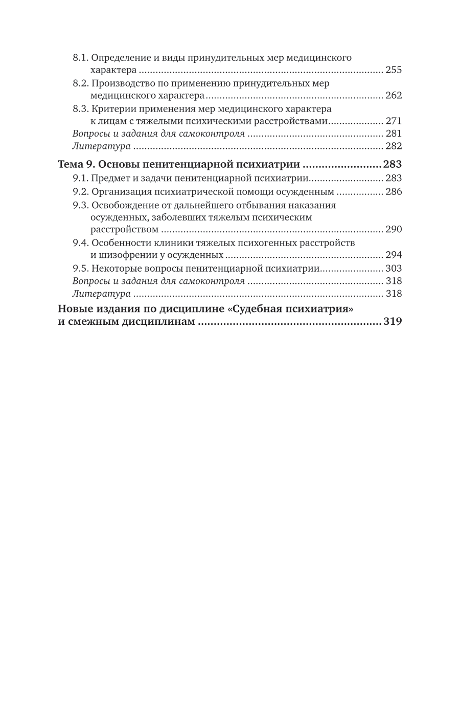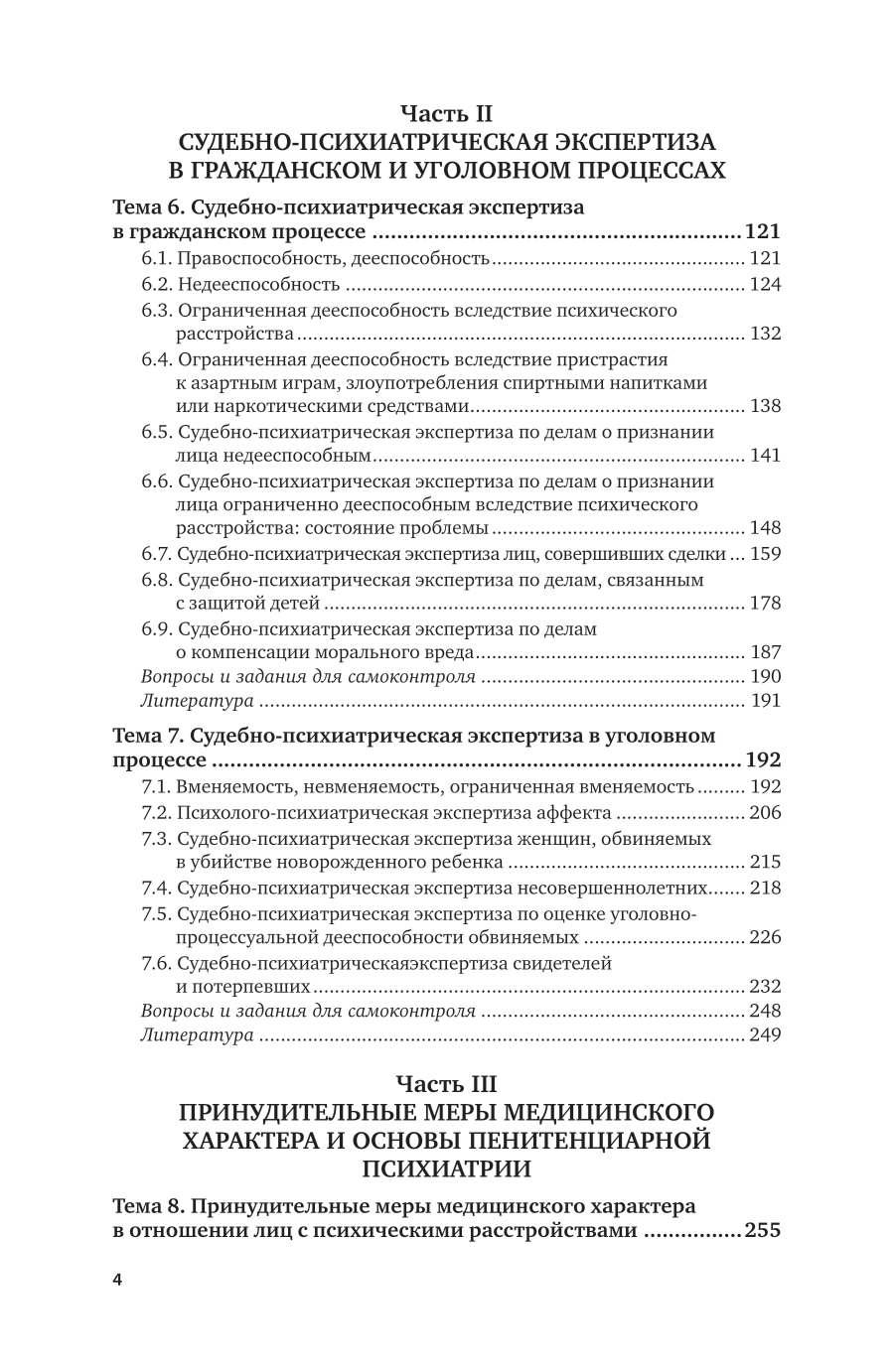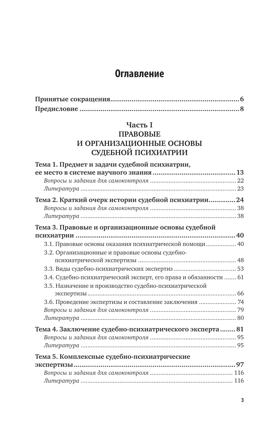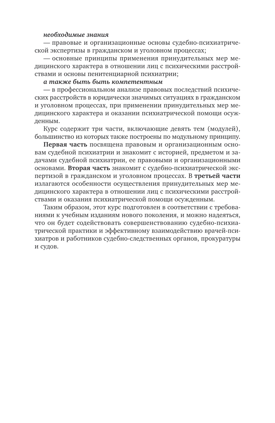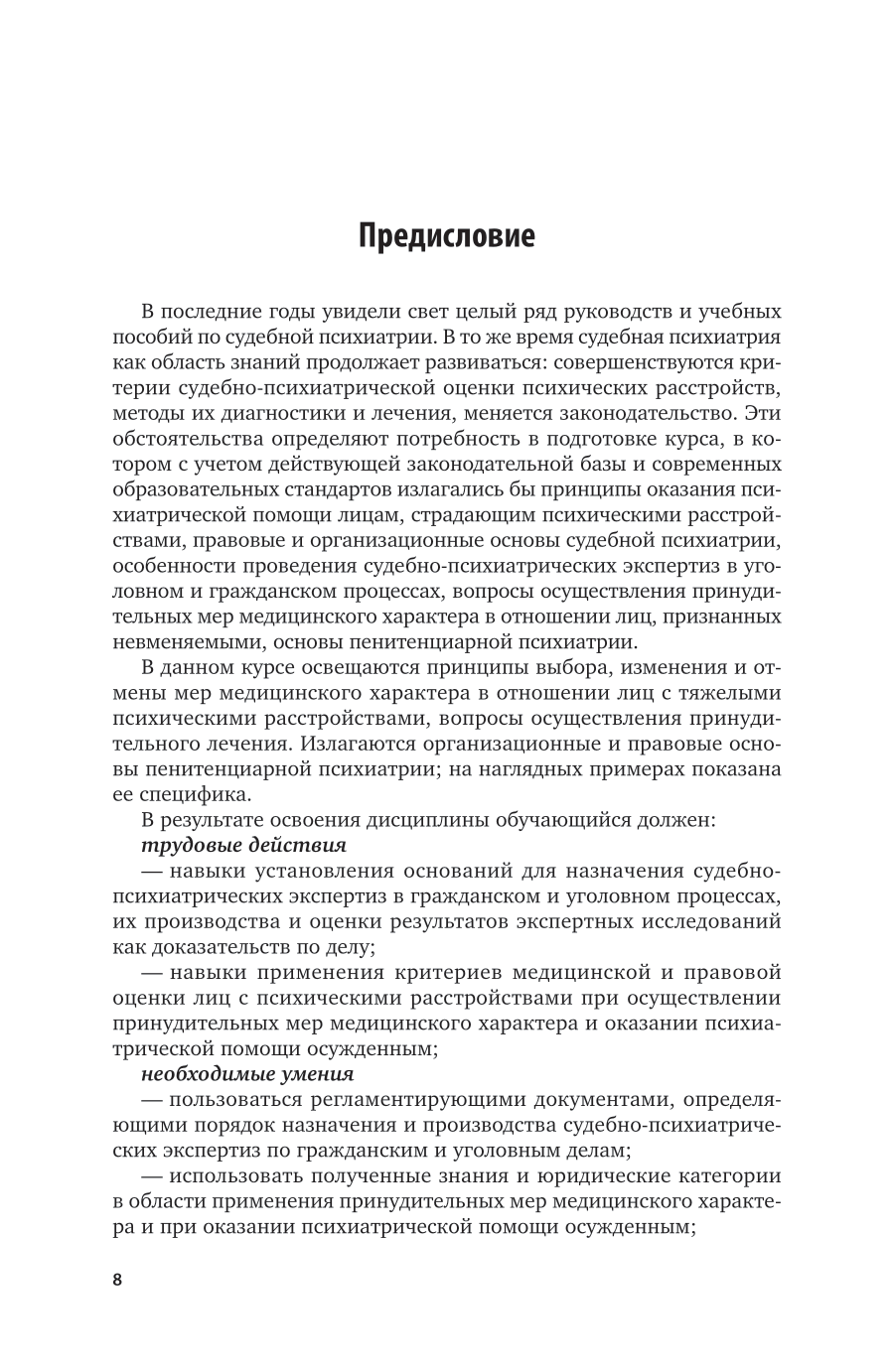 В курсе освещаются правовые и организационные аспекты судебно-психиатрических экспертиз в уголовном и гражданском процессах, вопросы применения принудительных мер медицинского характера, проблемы пенитенциарной психиатрии. Соответствует актуальным требованиям федерального государственного образовательного стандарта среднего профессионального образования и профессиональным требованиям. Для студентов учебных заведений среднего профессионального образования, обучающихся по юридическим направлениям.