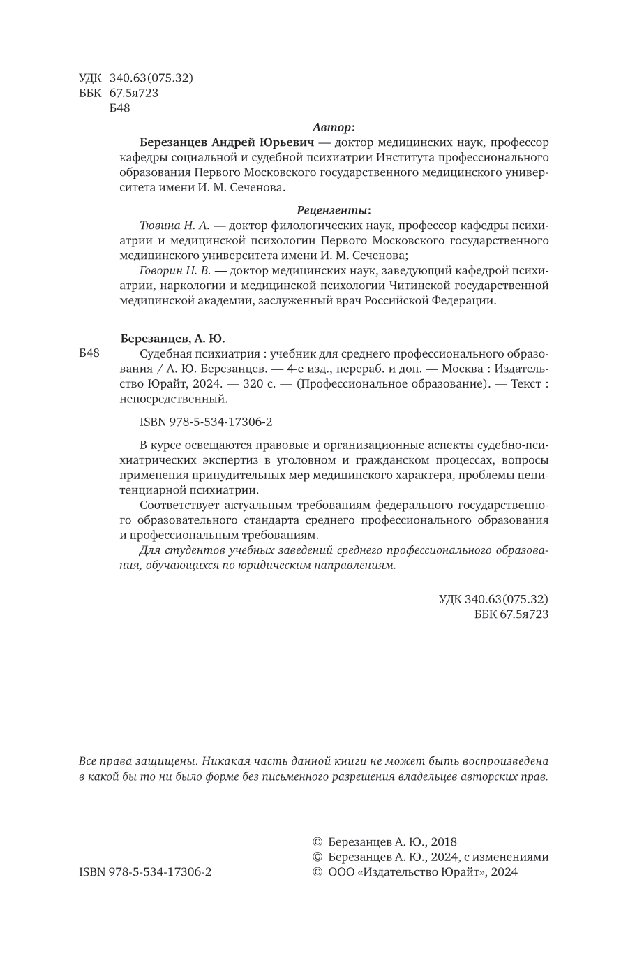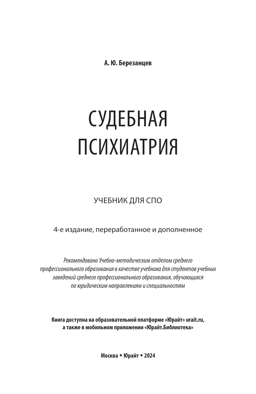 Судебная психиатрия 4-е изд. пер. и доп. Учебник для СПО (Андрей Юрьевич Березанцев); ЮРАЙТ, 2024