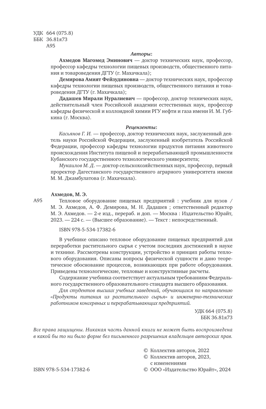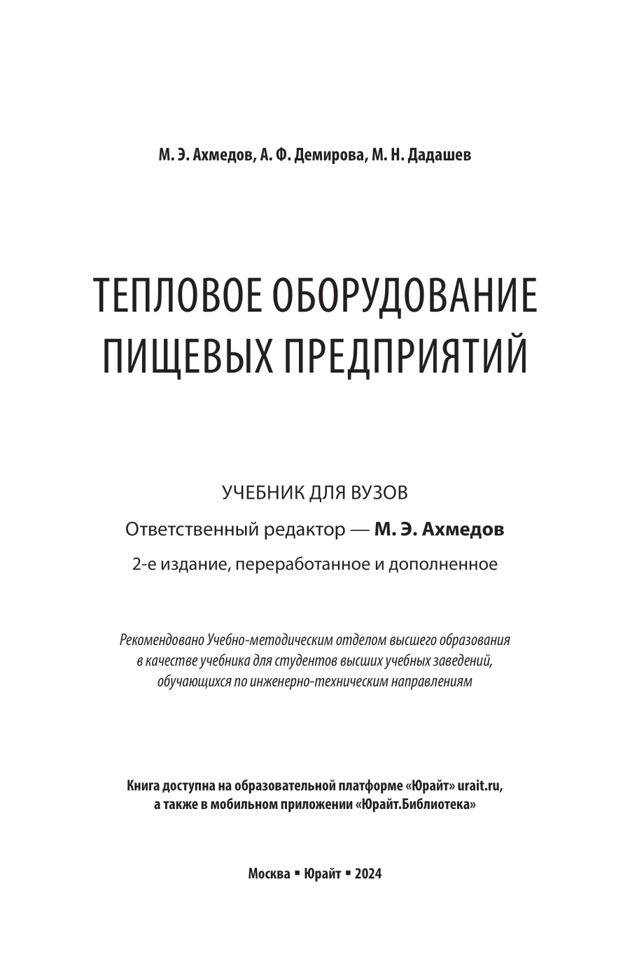 Тепловое оборудование пищевых предприятий 2-е изд. пер. и доп. Учебник для вузов (Мирали Нуралиевич Дадашев); ЮРАЙТ, 2024