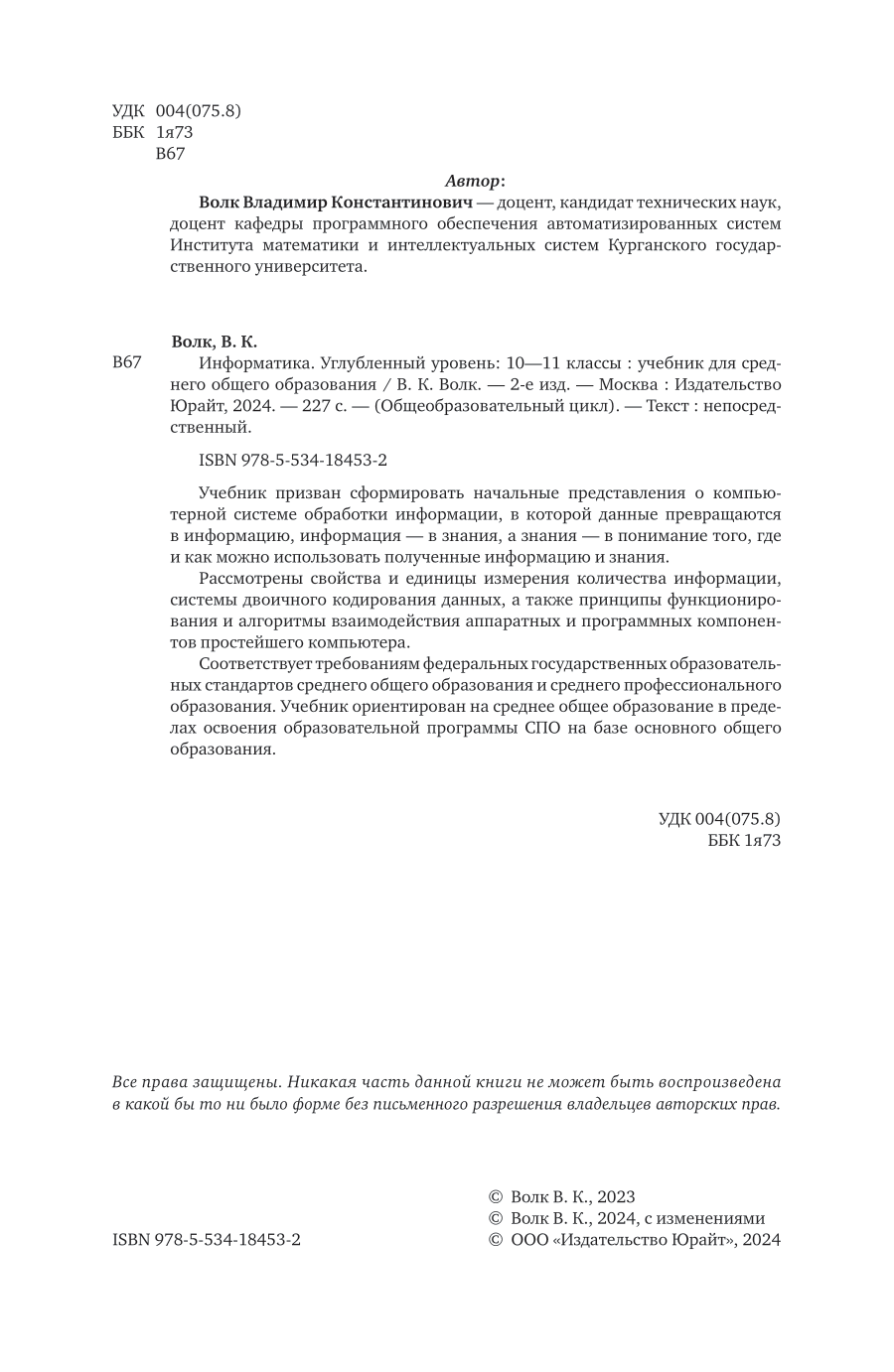 Информатика. Углубленный уровень: 10-11 классы 2-е изд. Учебник для СОО (Владимир Константинович Волк); ЮРАЙТ, 2024