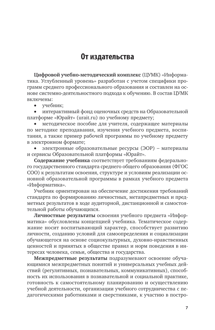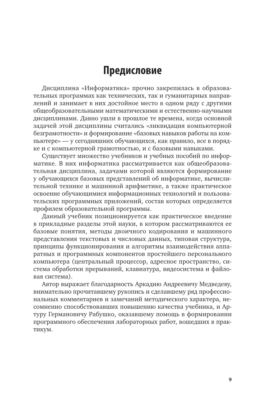 Учебник призван сформировать начальные представления о компьютерной системе обработки информации, в которой данные превращаются в информацию, информация - в знания, а знания - в понимание того, где и как можно использовать полученные информацию и знания. Рассмотрены свойства и единицы измерения количества информации, системы двоичного кодирования данных, а также принципы функционирования и алгоритмы взаимодействия аппаратных и программных компонентов простейшего компьютера. Соответствует требованиям федеральных государственных образовательных стандартов среднего общего образования и среднего профессионального образования. Учебник ориентирован на среднее общее образование в пределах освоения образовательной программы СПО на базе основного общего образования.