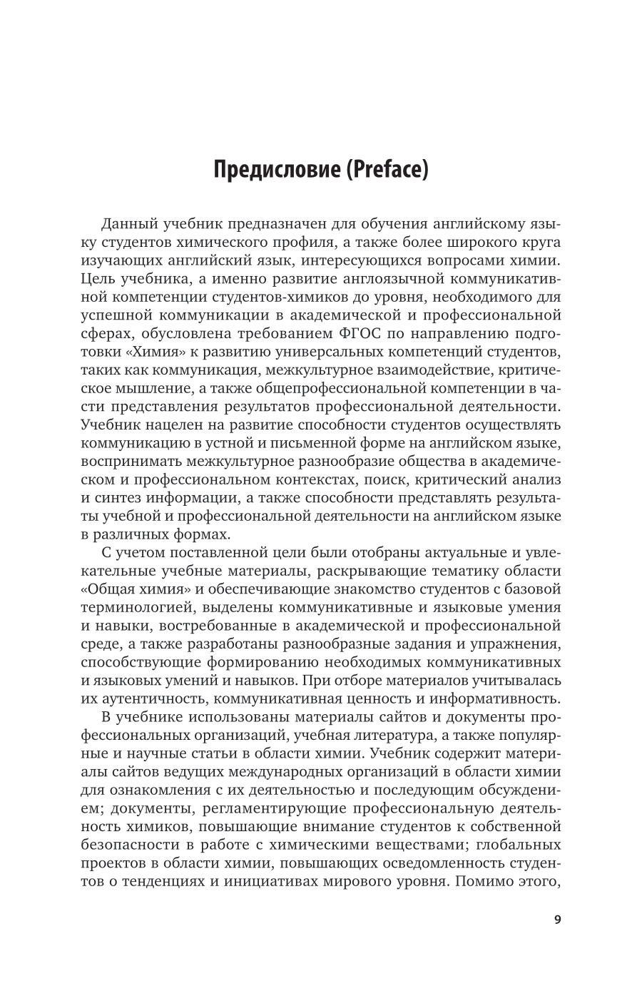 Курс предназначен для обучения английскому языку студентов вузов химического профиля, а также более широкого круга изучающих английский язык, интересующихся вопросами химии. Цель курса - развитие англоязычной коммуникативной компетенции студентов-химиков до уровня, необходимого для успешной коммуникации в академической и профессиональной сферах. Материал курса обеспечивает формирование умений академического и профессионального общения на английском языке в устной и письменной форме, способствует развитию лексических и грамматических навыков, а также совершенствованию навыков критического мышления. В курсе использованы материалы сайтов и документы профессиональных организаций, учебная литература, а также популярные и научные статьи в области химии. В учебнике рассматриваются как общенаучные, так и специальные темы, относящиеся к дисциплине «Общая химия». Курс содержит интересные и разнообразные задания и упражнения на развитие основных коммуникативных и языковых умений и навыков, иллюстративный материал, справочную информацию, дополнительные материалы для аудиторной и внеаудиторной работы, а также онлайн поддержку в виде упражнений, созданных на платформе Wordstool. Соответствует актуальным требованиям федерального государственного образовательного стандарта среднего профессионального образования и профессиональным требованиям.