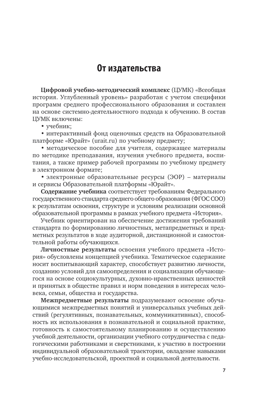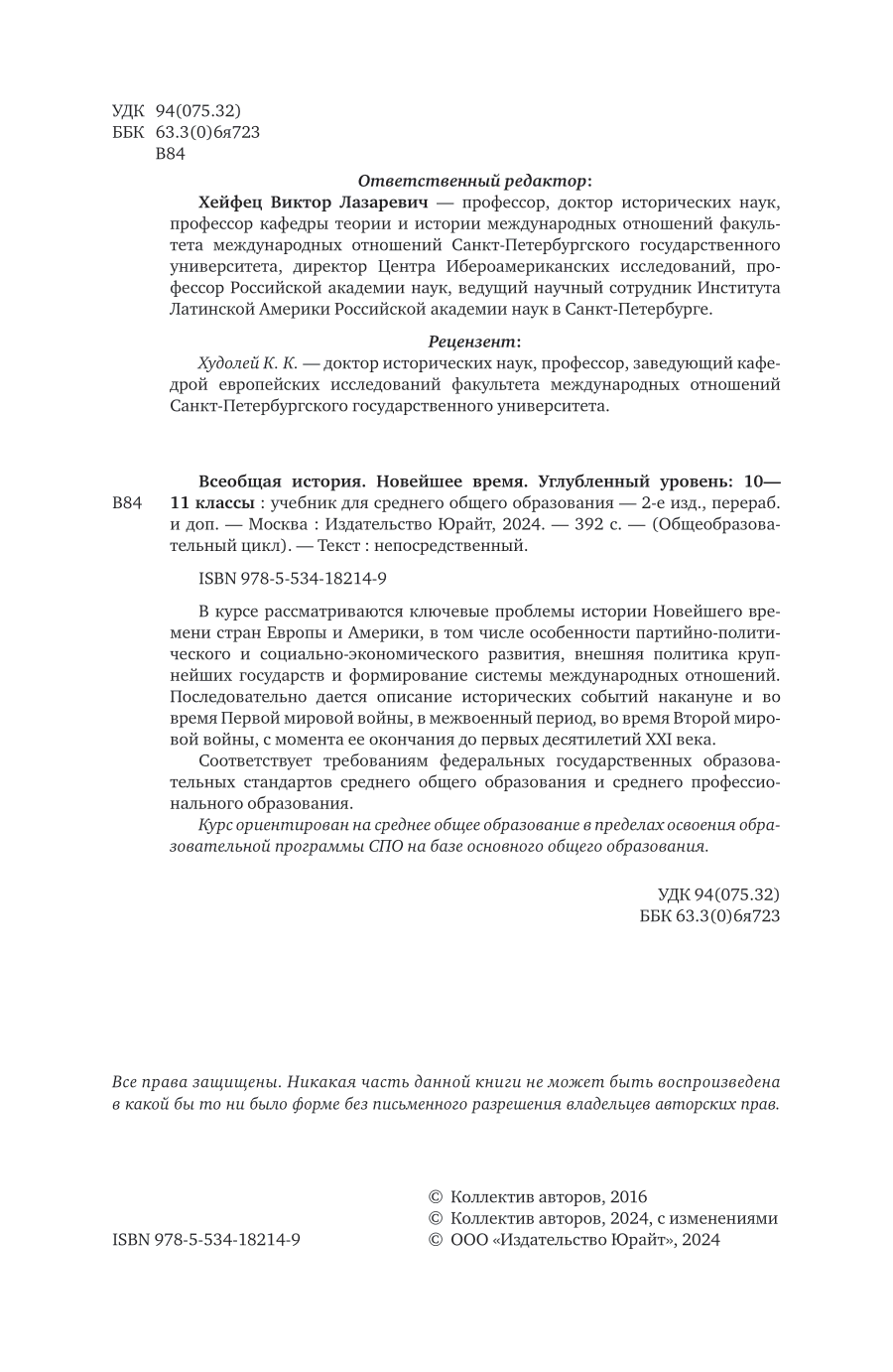 В курсе рассматриваются ключевые проблемы истории Новейшего времени стран Европы и Америки, в том числе особенности партийно-политического и социально-экономического развития, внешняя политика крупнейших государств и формирование системы международных отношений. Последовательно дается описание исторических событий накануне и во время Первой мировой войны, в межвоенный период, во время Второй мировой войны, с момента ее окончания до первых десятилетий XXI века. Соответствует требованиям федеральных государственных образовательных стандартов среднего общего образования и среднего профессионального образования. Курс ориентирован на среднее общее образование в пределах освоения образовательной программы СПО на базе основного общего образования.