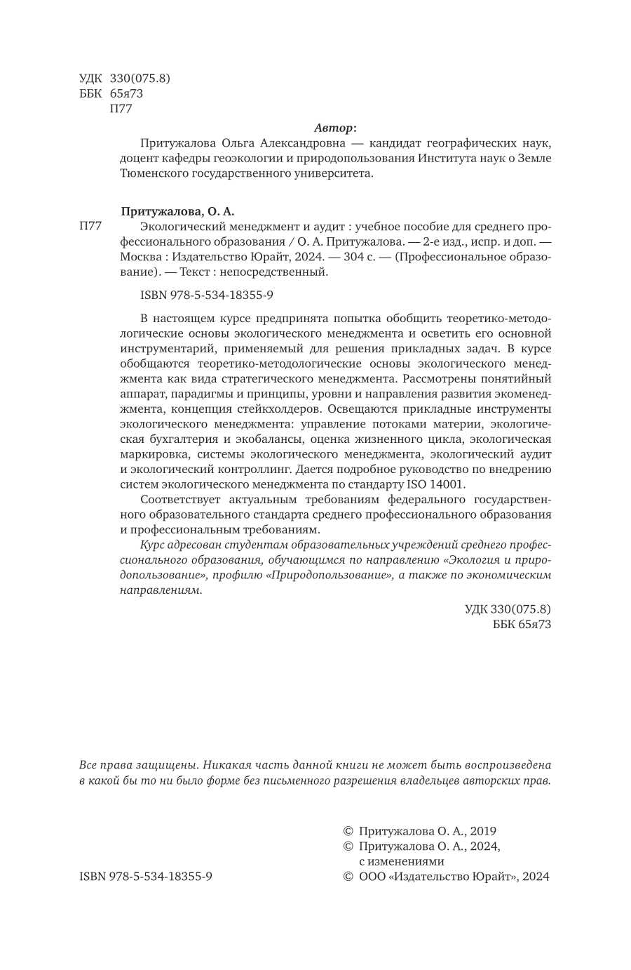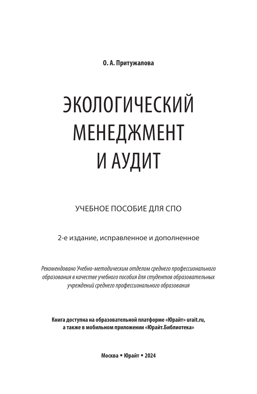 Экологический менеджмент и аудит 2-е изд. испр. и доп. Учебное пособие для СПО (Ольга Александровна Притужалова), 2024