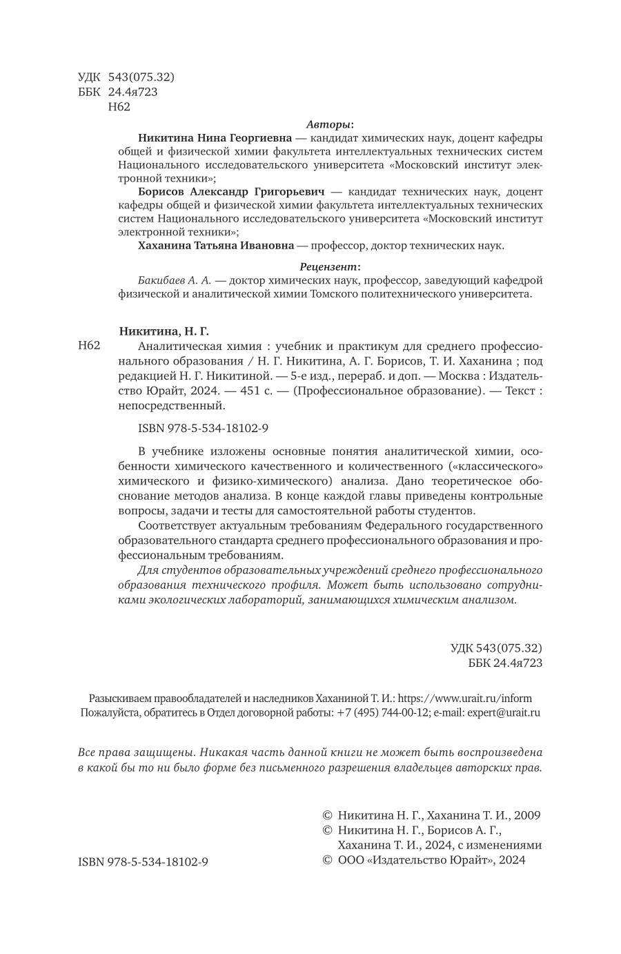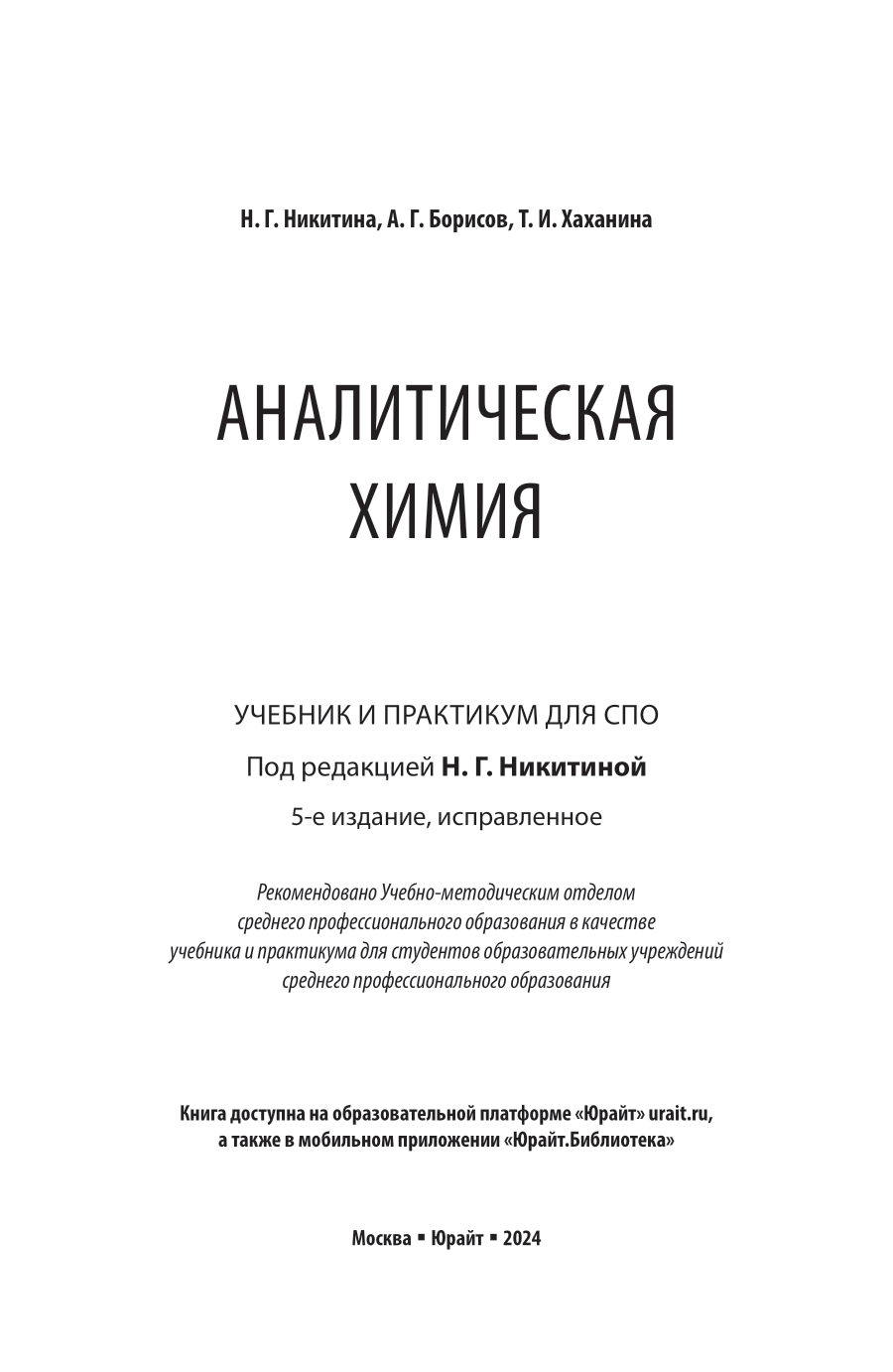 Аналитическая химия 5-е изд. пер. и доп. Учебник и практикум для СПО (Татьяна Ивановна Хаханина); ЮРАЙТ, 2024