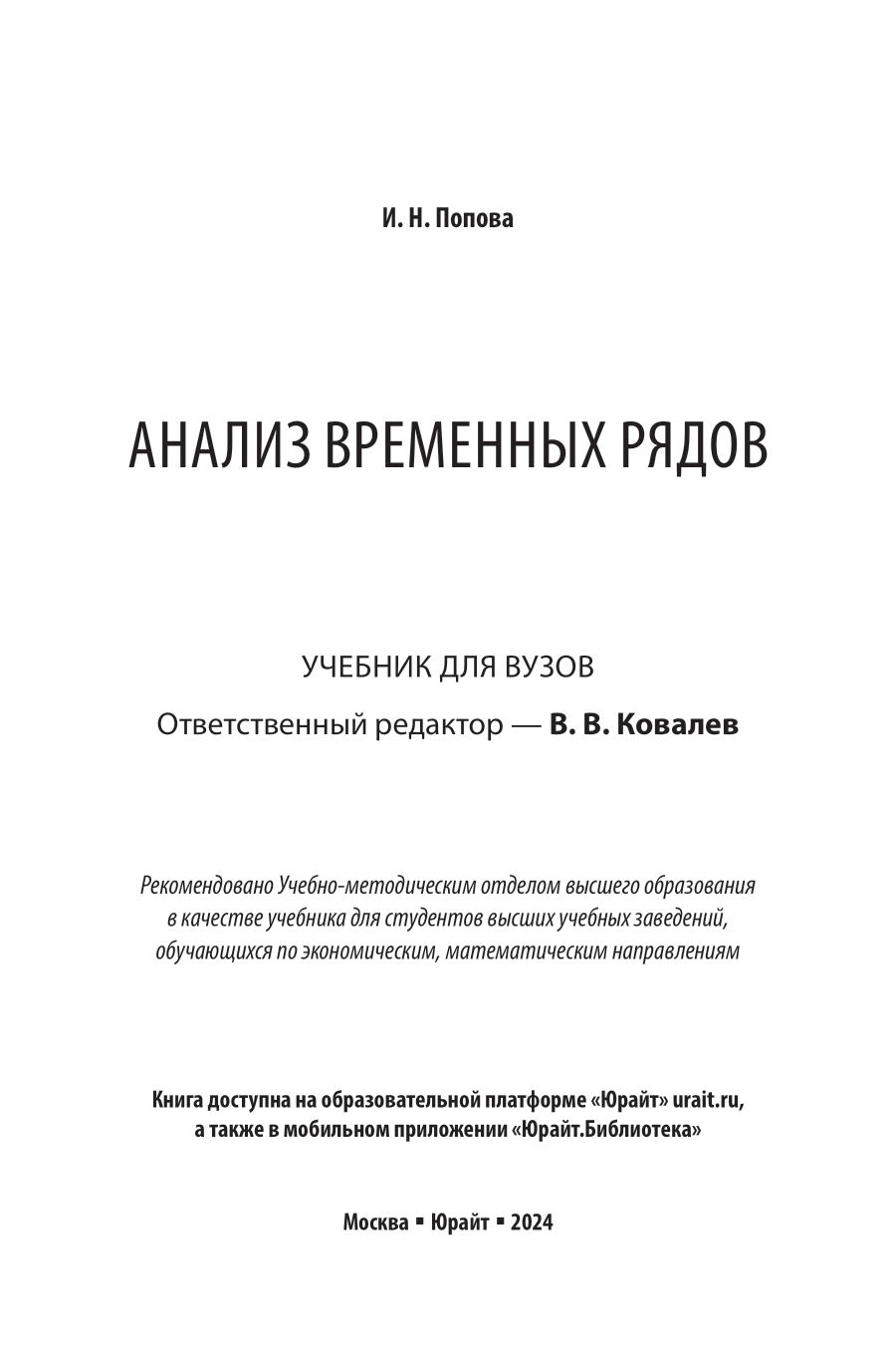 Анализ временных рядов. Учебник для вузов (Ирина Николаевна Попова); ЮРАЙТ, 2024