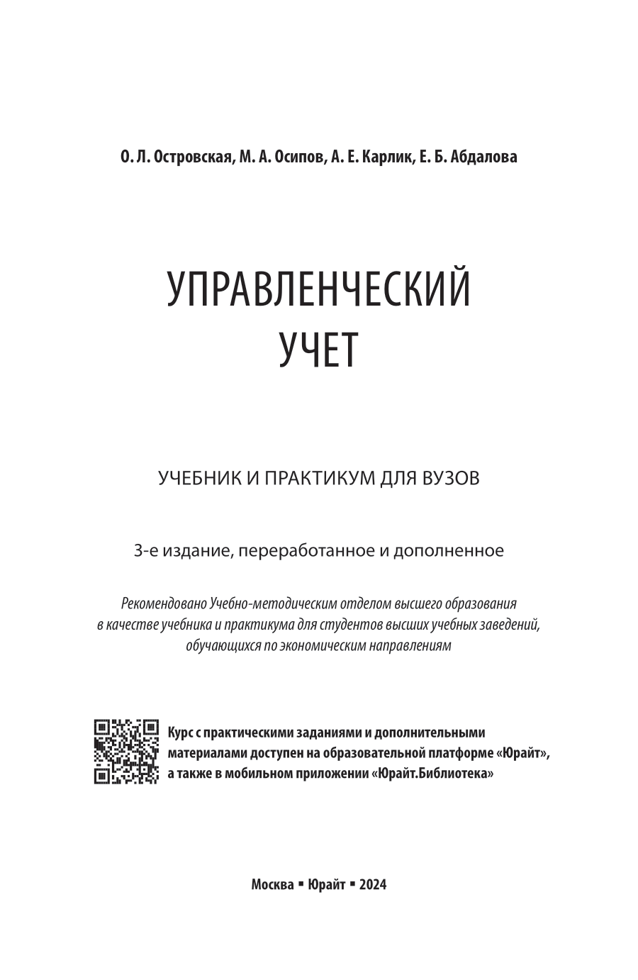 Материалы учебника содержат в себе необходимый минимум профессиональной информации, изучение которой позволяет сформировать профессиональные компетенции выпускников программ прикладного бакалавриата по дисциплине управленческий учет. Успешное освоение учебных материалов позволит сформировать общекультурные, общепрофессиональные и профессиональные компетенции. В конце каждой главы представлен практикум, включающий вопросы и задания для самостоятельной работы, который поможет студенту самостоятельно подготовиться к зачету или экзамену. Соответствует актуальным требованиям Федерального государственного образовательного стандарта высшего образования. Предназначено для бакалавров по направленности подготовки: «Экономика», «Менеджмент», «Финансы и кредит», «Экономическая безопасность», «Бизнес-информатика», «Государственное и муниципальное управление».