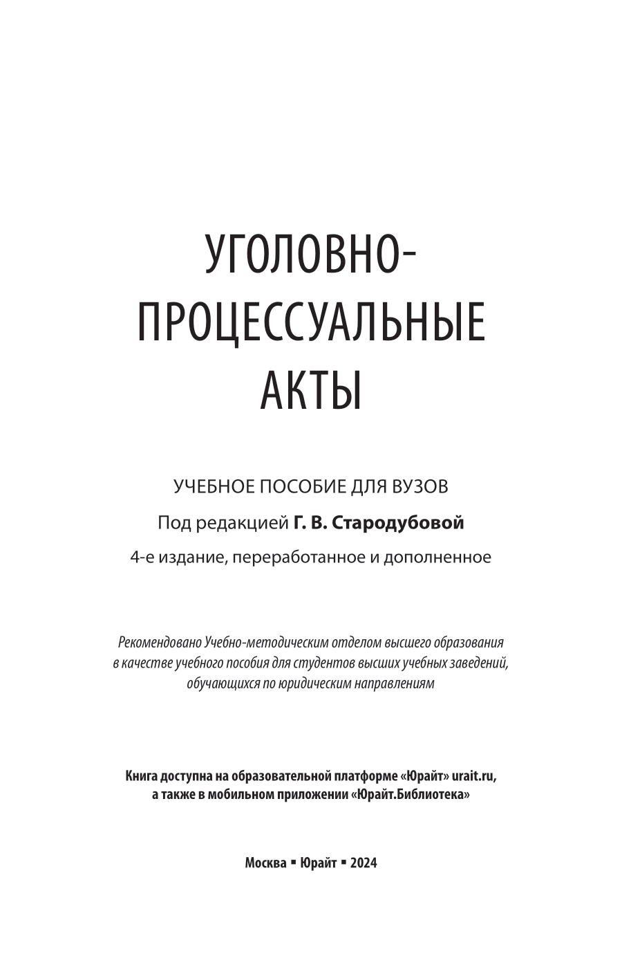 Уголовно-процессуальные акты 4-е изд. пер. и доп. Учебное пособие для вузов (Кузнецов Анатолий Николаевич, Моргачева Лариса Алексеевна, Стародубова Галина Викторовна, Баева Ксения Максимовна, Панько Надежда Константиновна, Малахова Людмила Ивановна, Астафьев Алексей Юрьевич), 2024