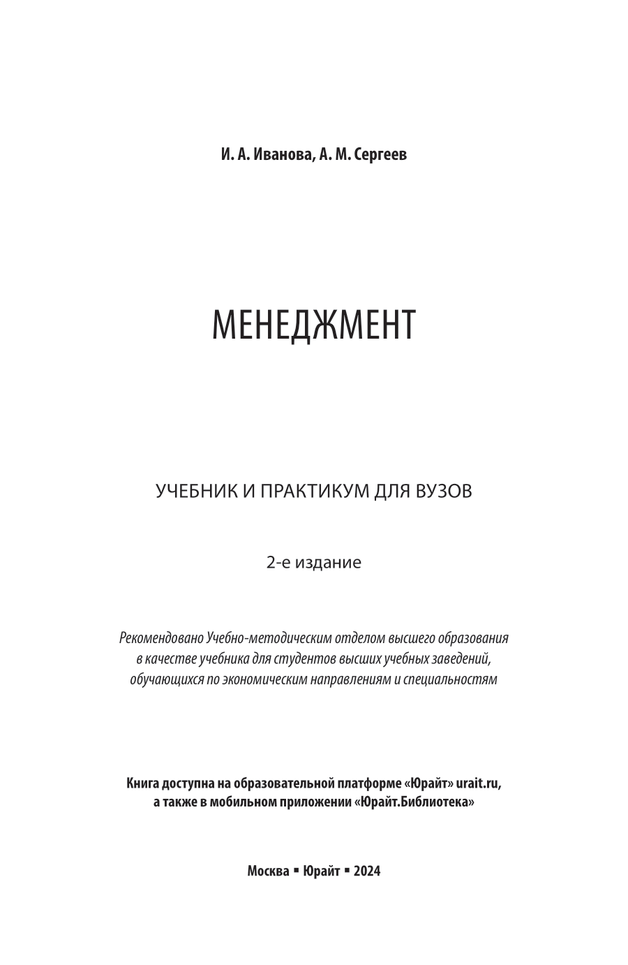 Менеджмент 2-е изд. Учебник и практикум для вузов (Александр Михайлович Сергеев); ЮРАЙТ, 2024
