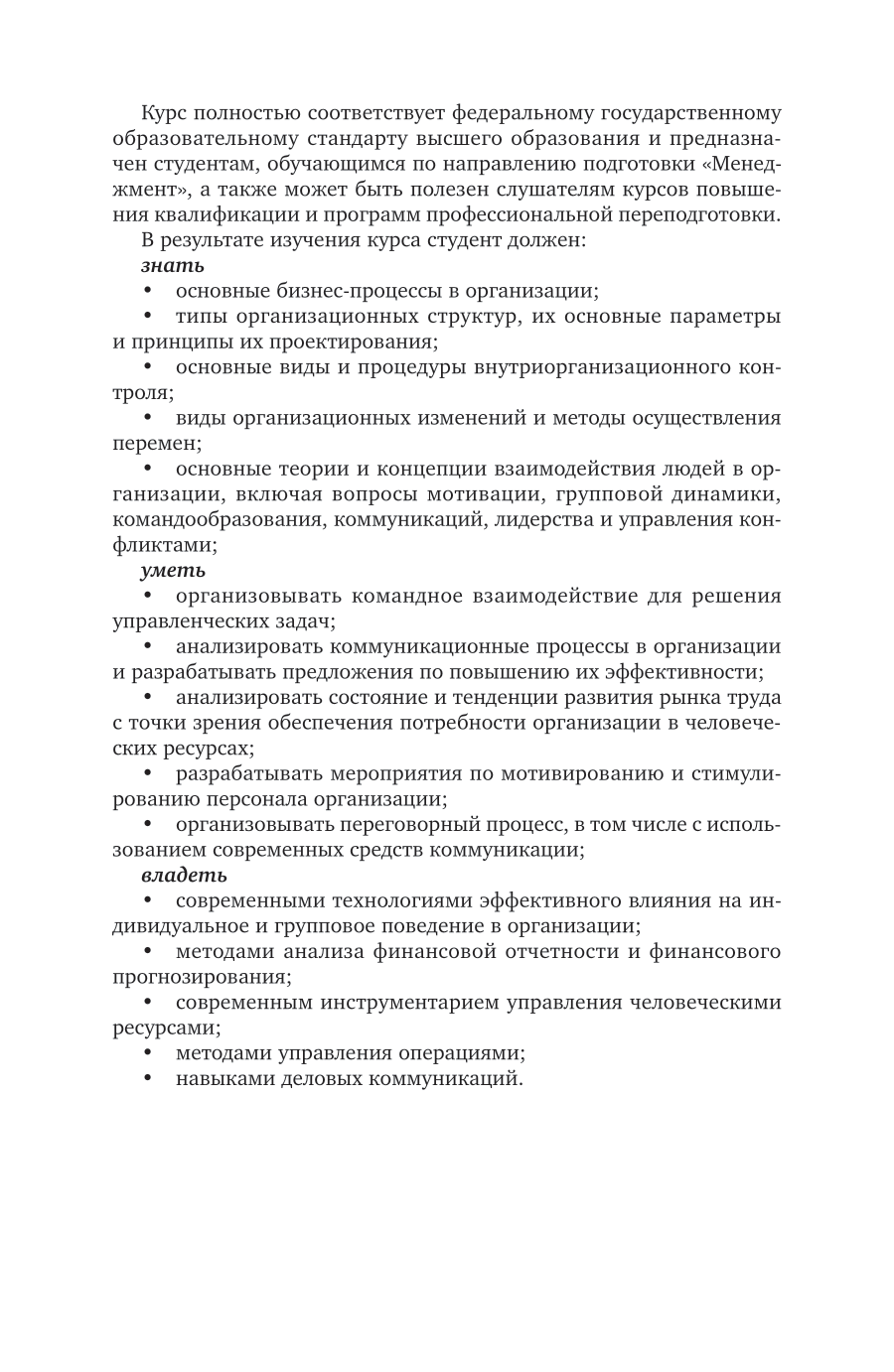 Менеджмент в данном курсе рассматривается в различных аспектах: и как научная дисциплина, и как средство управления компанией и ее выживаемостью (например, за счет инноваций), и как форма отношений между людьми. Особенность курса - особое внимание к роли человека как ключевого стратегического ресурса современной организации и поведенческим аспектам менеджмента в целом. В нем рассматриваются как классические, так и современные теории управления, которые полезно знать не только студентам, но и практикующим менеджерам. Соответствует актуальным требованиям федерального государственного образовательного стандарта высшего образования. Для студентов высших учебных заведений, обучающихся по экономическим направлениям и специальностям.